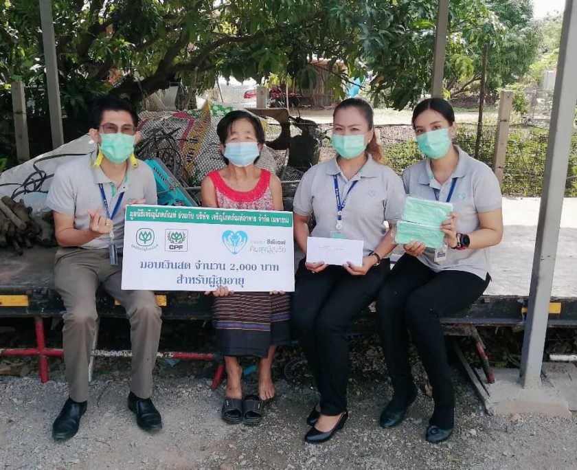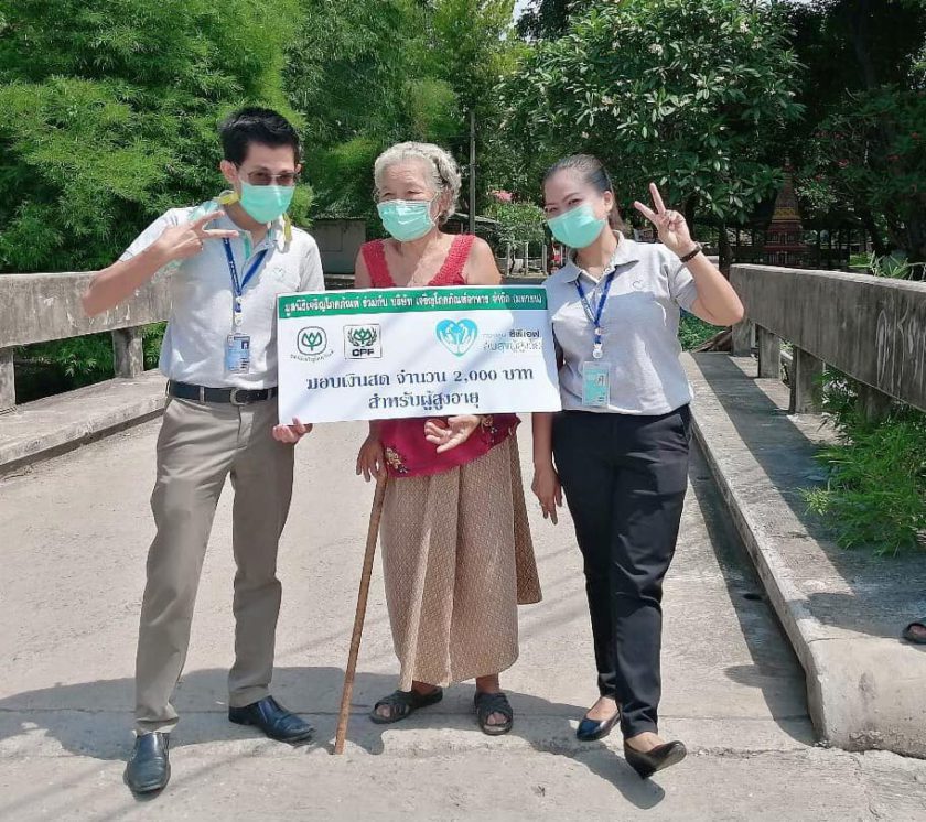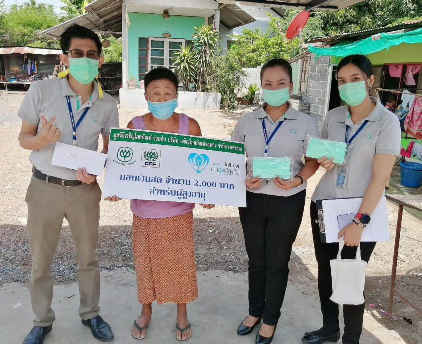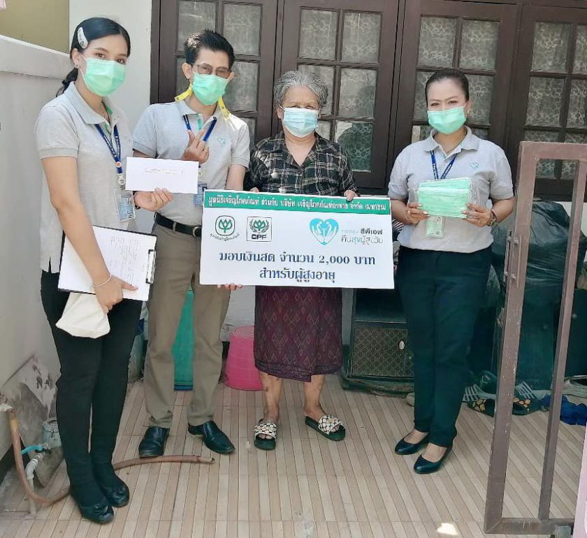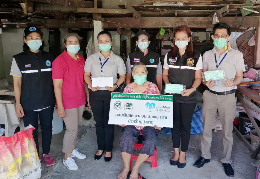 คุณภัครดา แสนสง่า ผู้จัดการสำนักธุรการ, คุณเจษฎาพร รัฐประสาท ผู้จัดการฝ่ายธุรการ พร้อมด้วยพนักงาน CPF โรงงานแปรรูปเนื้อไก่ สระบุรี ร่วมกับ คุณศิริรัตน์ สายคำภา ผู้ใหญ่บ้าน หมู่ 7 ต.ตาลเดี่ยว และเจ้าหน้าที่ อสม.สาธารณสุข ต.ตาลเดี่ยว เดินหน้าโครงการ “ซีพีเอฟ คืนสุข ผู้สูงวัย” อย่างต่อเนื่อง ออกเยี่ยมผู้สูงอายุในโครงการ 8 ราย พร้อมตรวจสุขภาพในเบื้องต้น พร้อมทั้งมอบหน้ากากอนามัยซีพี เพื่อใช้ป้องกันเชื้อโควิด-19 และมอบเงินช่วยเหลือ 2,000 บาท เพื่อใช้ดำรงชีพ
