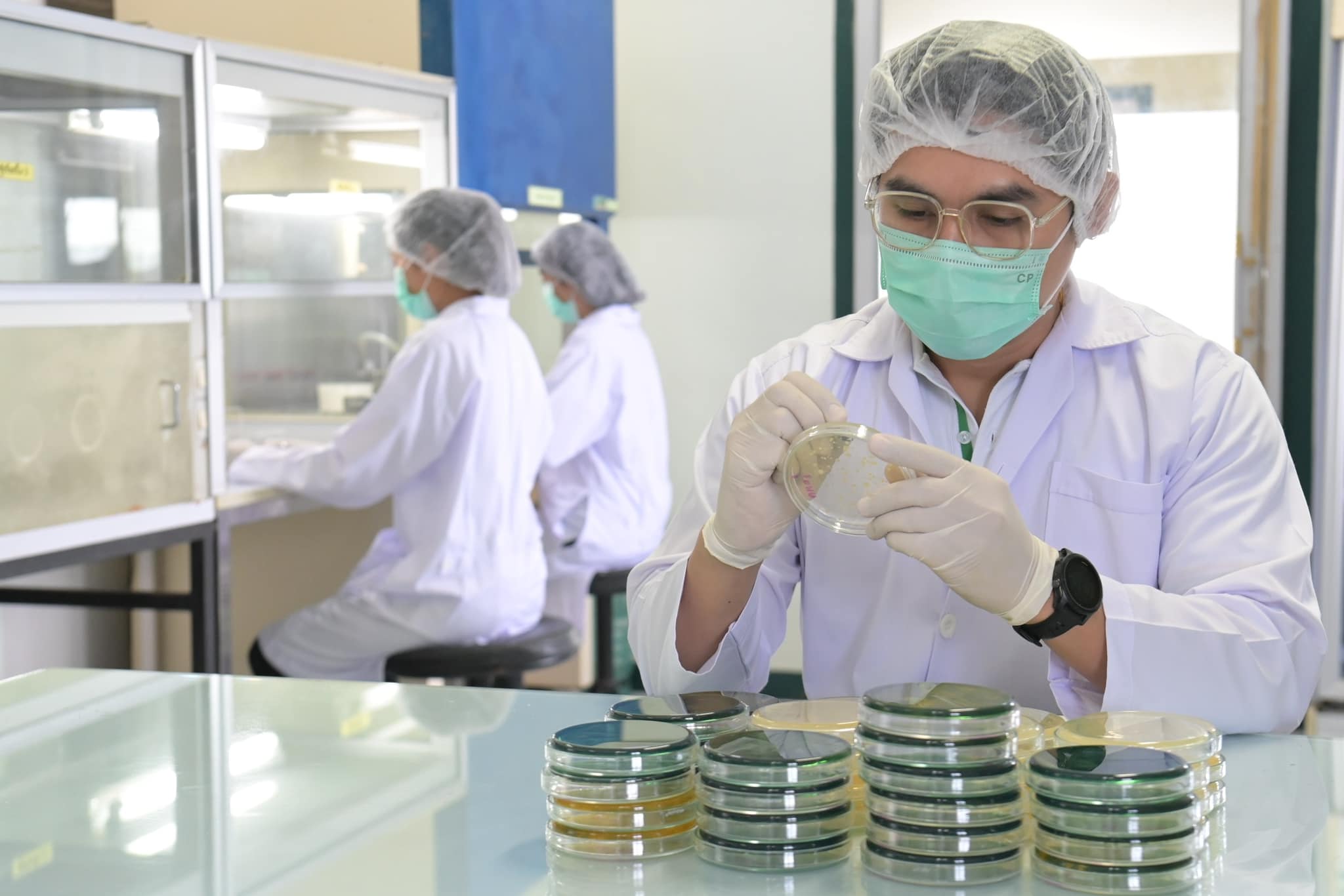 คุณเชี่ยวชาญ ผลพนิชรัศมี รองกรรมการผู้จัดการ ด้านวิจัยการเลี้ยงกุ้งและเทคโนโลยีชีวภาพ CPF เปิดเผยว่า ปัจจุบันผู้บริโภคตระหนักถึงความปลอดภัยด้านอาหารเป็นสำคัญ ศูนย์วิจัยการเลี้ยงกุ้ง จึงคิดค้นพัฒนานวัตกรรมการใช้ โปรไบโอติก หรือจุลินทรีย์มีชีวิตชนิดที่มีประโยชน์มาประยุกต์ในการผลิตวัตถุดิบอาหารให้ปลอดการใช้ยาปฏิชีวนะ เพื่อส่งต่ออาหารปลอดภัย ปลอดสารถึงผู้บริโภค สำหรับ “โปรไบโอติก” ที่ศูนย์วิจัยฯ ค้นคว้าพัฒนานำมาใช้ในการเพาะเลี้ยงกุ้ง เน้นโปรไบโอติกหลักใน 2 กลุ่ม ได้แก่ กลุ่มแรก เป็นโปรไบโอติกที่เกี่ยวข้องกับการปรับปรุงจุลินทรีย์ภายในทางเดินอาหารของสัตว์โดยตรง เน้นจุลินทรีย์ที่ช่วยย่อยอาหาร สร้างเอนไซม์ที่หลากหลาย สามารถยับยั้งการเจริญเติบโตของเชื้อก่อโรคในทางเดินอาหาร รวมถึงเน้นจุลินทรีย์ที่ช่วยกระตุ้นระบบภูมิคุ้มกันของสัตว์ ทำให้สัตว์มีสุขภาพแข็งแรง สามารถต่อต้านเชื้อก่อโรคได้ดี และกลุ่มที่ 2 เน้นคัดเลือกโปรไบโอติกที่ช่วยปรับปรุงคุณภาพน้ำและพื้นบ่อเลี้ยงให้เหมาะสมกับการอยู่อาศัยของสัตว์น้ำ
