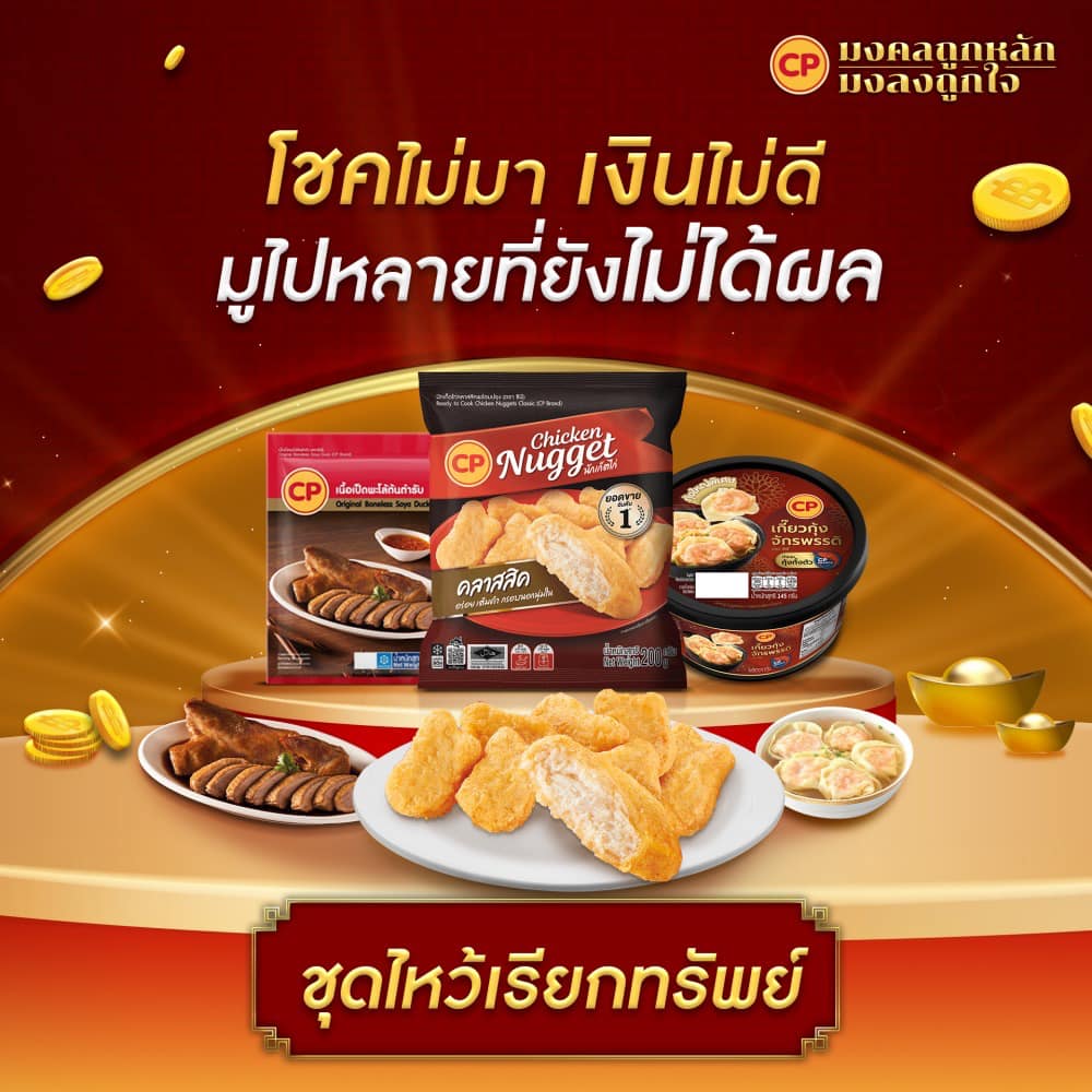 ชุดไหว้เสริมสิริมงคลทั้ง 3 ชุด ได้แก่ 1. “ชุดงานก้าวหน้า” เสริมความมั่นคง ช่วยการงานให้เจริญก้าวหน้า ประกอบด้วย ‘ซีพี เนื้อเป็ดย่างเครื่องเทศ สไตล์ฮ่องกง’ เสริมก้าวย่างสู่ความสำเร็จในหน้าที่การงาน ได้เพิ่มยศ เลื่อนตำแหน่ง ด้วย ‘ซีพี ขาหมู หมูสามชั้นคูโรบูตะในน้ำพะโล้ และสะโพกหมูต้ม’ เสริมความมั่นคง มั่งคั่ง ร่ำรวย มีกินมีใช้ตลอดทั้งปีไปกับ ‘นักเก็ตไก่’ ช่วยหนุนนำความก้าวหน้า เงินทองไหลมาเทมา เหมือนทองแท่ง ไม่ขัดสนตลอดทั้งปี 2. “ชุดเรียกทรัพย์” ช่วยเรื่องโชคลาภ ความเจริญรุ่งเรือง ร่ำรวยเงินทองไม่ขาดมือ ประกอบด้วย ‘ซีพี เนื้อเป็ดพะโล้ต้นตำรับ’ สื่อถึงความเก่งกาจรอบด้าน มีเงินใช้จ่ายคล่อง ‘ซีพี เกี๊ยวกุ้งจักรพรรดิ’ ได้โชคลาภก้อนใหญ่ ดึงดูดแต่ความเฮง โชคดีตลอดปี และ ‘นักเก็ตไก่’ 3. “ชุดเมตตามงลง” เสริมดวงชะตามหาเสน่ห์ ความมงคลสู่ชีวิต ผู้ใหญ่เมตตาเอ็นดูคอยช่วยเหลือให้ประสบความสำเร็จ ประกอบด้วย ‘ซีพี เนื้อเป็ดย่างเครื่องเทศ สไตล์ฮ่องกง’ ‘ซีพี เนื้อเป็ดพะโล้ต้นตำรับ’ ‘ซีพี ขาหมู หมูสามชั้นคูโรบูตะในน้ำพะโล้ สะโพกหมูต้ม’ ‘ซีพี เกี๊ยวกุ้งจักรพรรดิ’ และ ‘นักเก็ตไก่’
