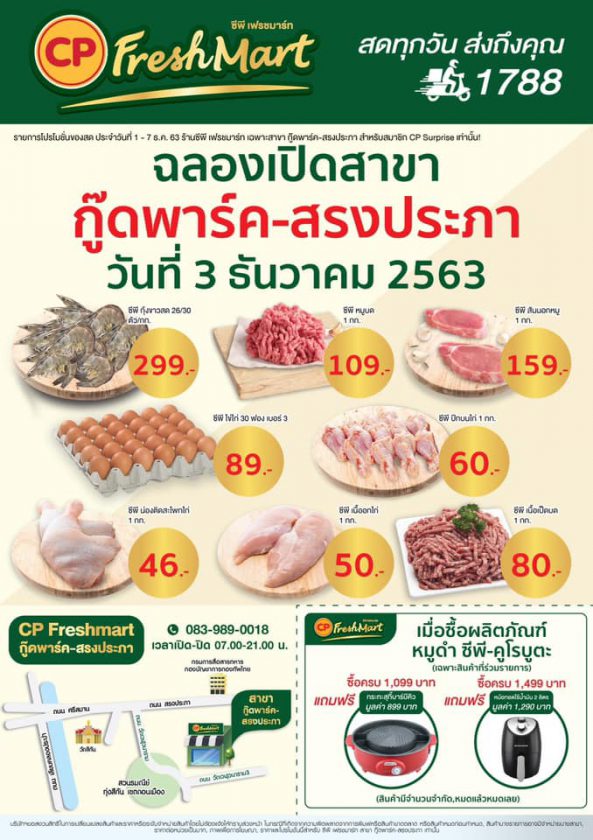 CP FreshMart สาขากู๊ดพาร์ค-สรงประภา ยังร่วมมือกับภาครัฐ จำหน่ายซีพีไก่สดธงฟ้า ลดค่าครองชีพในราคาประหยัด อาทิ เนื้อน่องติดสะโพกไก่ กิโลกรัมละ 46 บาท เนื้ออกไก่ กิโลกรัมละ 49 บาท และปีกบนไก่ กิโลกรัมละ 63 บาท โดยเปิดให้บริการทุกวัน ตั้งแต่เวลา 7.00-21.00 น. และยังให้บริการผ่าน E-Commerce ที่ลูกค้าสามารถสั่งซื้ออาหารได้ถึง 3 ช่องทาง ได้แก่ แอปพลิเคชัน CPFreshMart ซึ่งดาวน์โหลดได้จากมือถือทุกระบบ, สายด่วนฮอตไลน์ โทร.1788 หรือ 083-989-0018 และเว็บไซต์ www.cpfreshmartshop.com โดยร้านจะจัดส่งอาหารให้ฟรีแบบไม่ขั้นต่ำ ให้ถึงมือผู้รับภายในเวลาอันรวดเร็ว ตอบโจทย์วิถีปกติใหม่ได้อย่างลงตัว