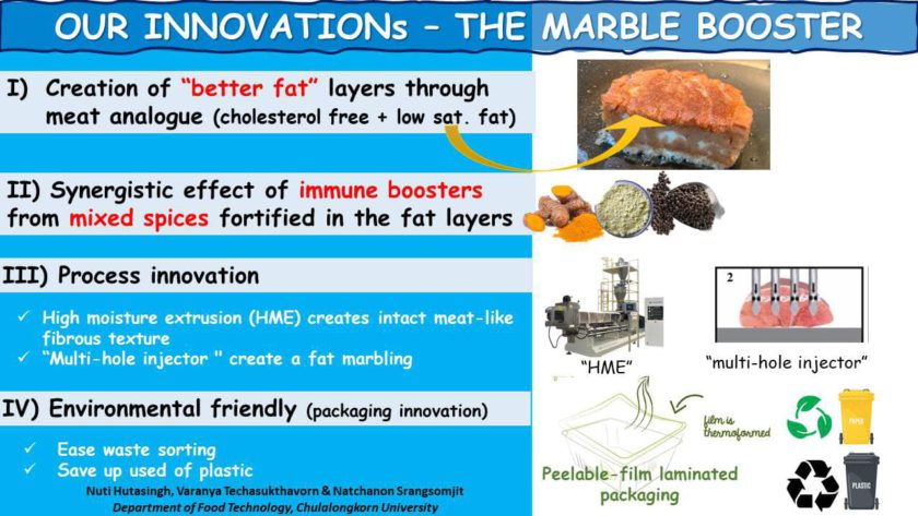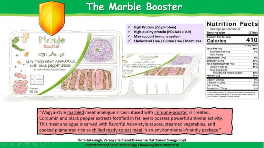 The Marble Booster เป็นการนำเสนอความคิดสร้างสรรค์ในการผลิตเนื้อเทียม (Meat Analogue) ที่ผลิตจากพืช 100% มีลักษณะคล้ายเนื้อสัตว์จริง มีโครงสร้างเป็นใยคล้ายกล้ามเนื้อสัตว์ ซึ่งใช้เทคโนโลยีที่ทันสมัยขึ้นรูปจากโปรตีนถั่วเหลือง และมีชั้นไขมันที่ผลิตจากน้ำมันคาโนลา สารสกัดจากขมิ้นชันและพริกไทดำแทรกอยู่ในชิ้นเนื้อ กลายเป็นเนื้อลายหินอ่อน เป็นการเลียนแบบเนื้อวากิว ซึ่งแตกต่างจากเนื้อสัตว์ plant-based ทั่วไป ที่เป็นลักษณะเนื้อบด อีกทั้งเนื้อสัตว์เทียมดังกล่าว ยังมีคุณสมบัติช่วยเสริมภูมิคุ้มกันจากสารประกอบเคอร์คิวมิน (Curcumin) จากขมิ้นชันและพิเพอรีน (Piperine) จากพริกไทดำ สารทั้งสองตัวนี้เมื่ออยู่รวมกันจะให้ฤทธิ์เสริมกัน (Synergistic effect) เสริมภูมิคุ้มกัน และเป็นมิตรกับสิ่งแวดล้อม