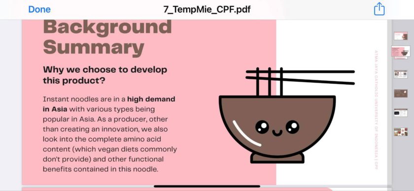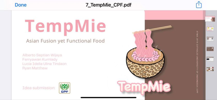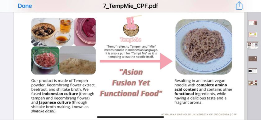 ส่วนทีม TempMie จากอินโดนีเซีย ที่ได้อันดับ 2 นำเสนอแนวคิดนวัตกรรมบะหมี่กึ่งสำเร็จรูปสำหรับ Vegan (instant vegan noodle) ทำจากแป้งถั่วเหลืองหมักแบบพื้นเมืองอินโดนีเซีย (Tempeh powder) สารสกัดเข้มข้นจากดอกไม้ Kecombrang และน้ำซุปเห็ดหอมชิตาเกะของญี่ปุ่น (Shiitake Broth) เป็นการผสมผสานวัฒนธรรมของอินโดนีเซียเข้ากับญี่ปุ่น