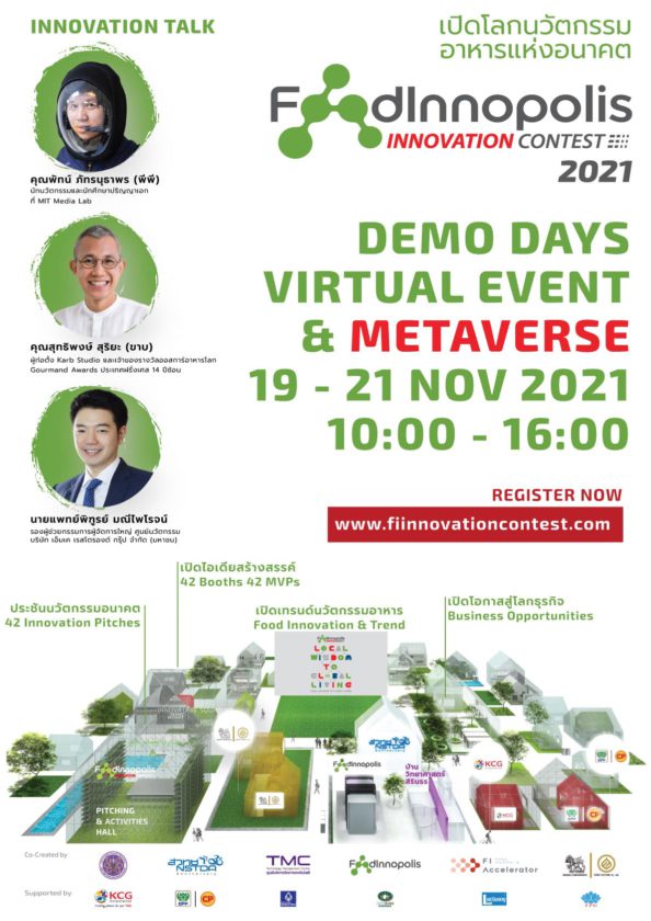 🚩 19-21 พ.ย. นี้ Food Innopolis เปิดเวทีออนไลน์ รับนวัตกรเลือดใหม่และการแสดงผลงานที่บ่มเพาะกันมา เป็นเวลากว่า 1 ปี ของ Finalist ทั้ง 42 ทีม พร้อมทั้งบูธ CPF โชว์นวัตกรรมอาหาร ร่วมกับหน่วยงานต่างๆ อย่างจุใจ และพบกับนักนวัตกรรมระดับโลกมาเปิดไอเดียล้ำๆ