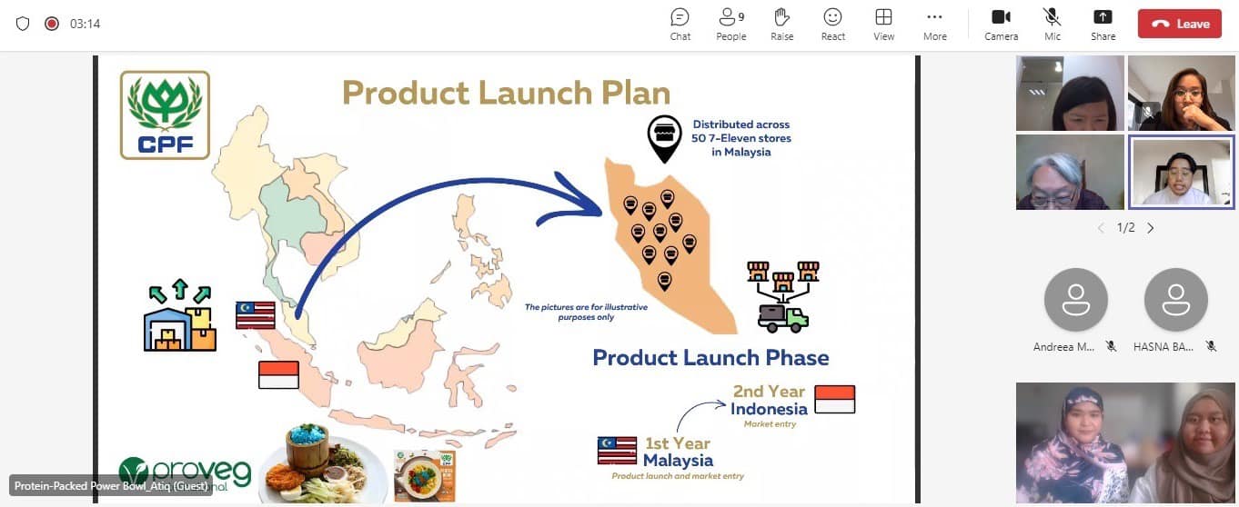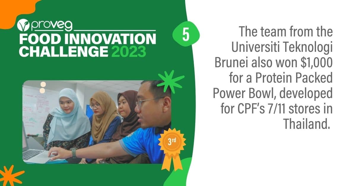 ในปีนี้ ซีพีเอฟ ได้เป็นผู้ให้คำปรึกษาและถ่ายทอดความรู้แก่ทีม Protein-Packed Power Bowl ซึ่งเป็นคณะนักศึกษาปริญญาโท จากสาขาวิทยาศาสตร์และเทคโนโลยีอาหาร มหาวิทยาลัยเทคโนโลยีบรูไน สถาบันอุดมศึกษาชั้นนำประเทศบรูไน ที่พัฒนาเนื้อจากพืช “Nasi Kerabu Bliss Bowl” โดยนำเอกลักษณ์อาหารพื้นเมืองมาเลย์ เน้นคุณค่าทางโภชนาการเพื่อสุขภาพที่ดี ผลิตตามหลักฮาลาล มีรสชาติที่ตอบโจทย์ผู้บริโภคชาวมุสลิมในเอเชีย ด้วยแนวคิดที่ต้องการพัฒนาเมนูอาหารท้องถิ่นของชาวเอเชีย และยึดหลักการพัฒนาที่ยั่งยืน ส่งเสริมการบริโภคอาหารที่ดีต่อสุขภาพและเป็นมิตรต่อสิ่งแวดล้อม ซึ่งทีม Protein-Packed Power Bowl ประสบความสำเร็จคว้ารางวัลรองชนะเลิศอันดับ 3 จากการแข่งขันที่มี 260 มหาวิทยาลัยในภูมิภาคร่วมส่งผลงานเข้าประกวด