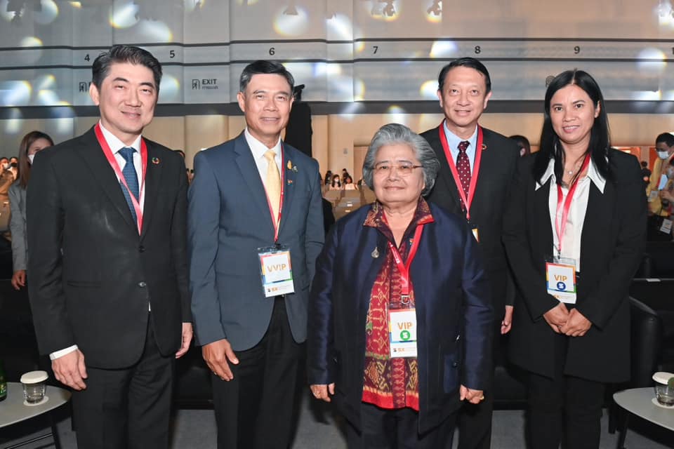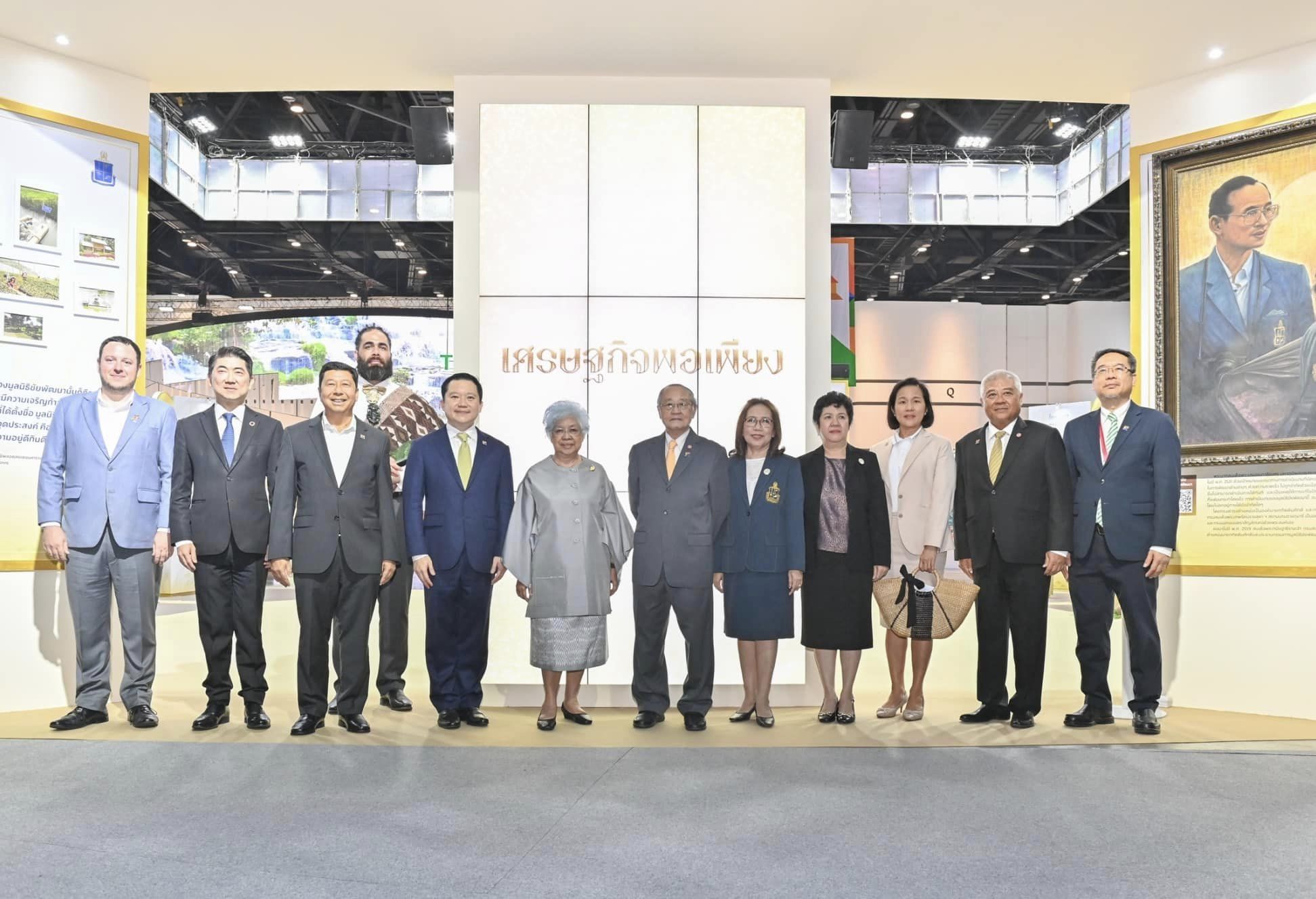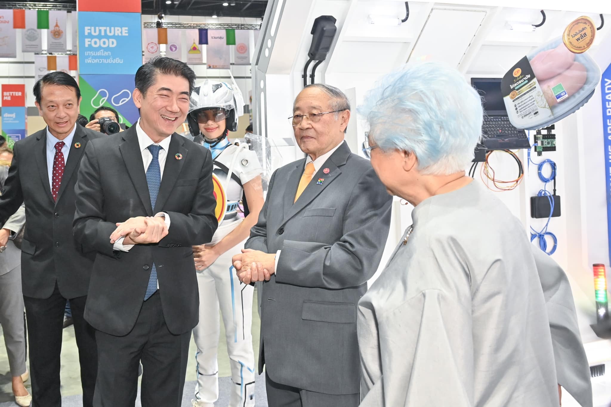 ดร.สุเมธ ตันติเวชกุล กรรมการและเลขาธิการมูลนิธิชัยพัฒนา พร้อมด้วย ท่านผู้หญิงบุตรี วีระไวทยะ ประธานกรรมการมูลนิธิแม่ฟ้าหลวง ในพระบรมราชูปถัมภ์ และ คุณฐาปน สิริวัฒนภักดี ประธานอำนวยการจัดงานมหกรรมความยั่งยืนที่ใหญ่ที่สุดในอาเซียน SUSTAINABILITY EXPO 2023 (SX2023) เยี่ยมชมบูธ บริษัท เจริญโภคภัณฑ์อาหาร จำกัด (มหาชน) หรือ ซีพีเอฟ นำภารกิจ “ไก่ไทยจะไปอวกาศ” หรือ Thai Food – Mission to Space ตอบโจทย์ความมั่นคงทางอาหาร ร่วมแสดงในงาน โดยมี คุณประสิทธิ์ บุญดวงประเสริฐ ประธานคณะผู้บริหาร ซีพีเอฟ พร้อมด้วยคณะผู้บริหาร คุณพีรพงศ์ กรินชัย ผู้บริหารสุงสุด สายงานวิศวกรรมกลาง และ คุณนลินี โรบินสัน ผู้บริหารสูงสุด สายงานวิจัยและพัฒนาผลิตภัณฑ์ ศูนย์วิจัยและพัฒนาอาหารซีพีเอฟ (CPF RD Center) ร่วมให้การต้อนรับ ณ ศูนย์ประชุมแห่งชาติสิริกิติ์