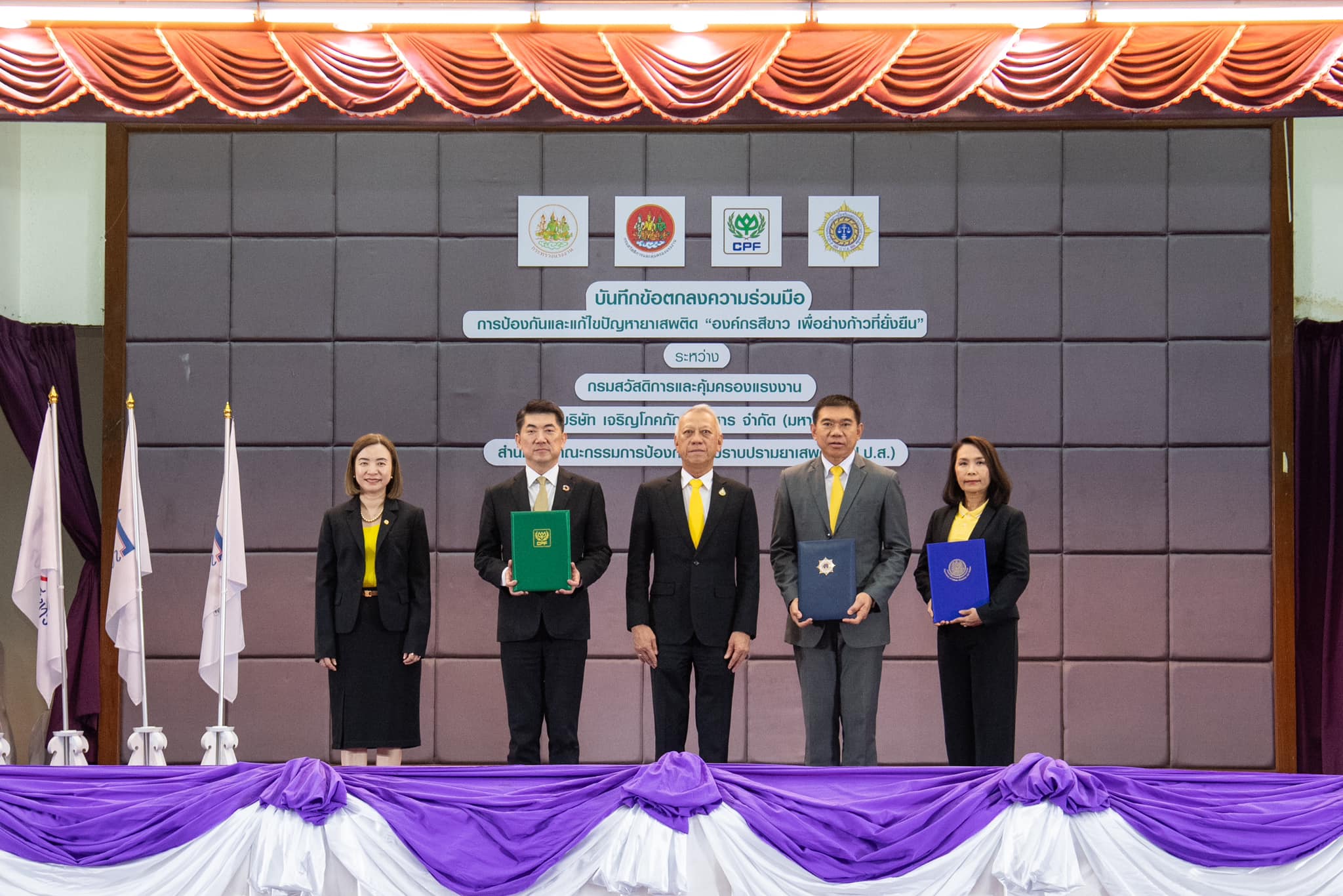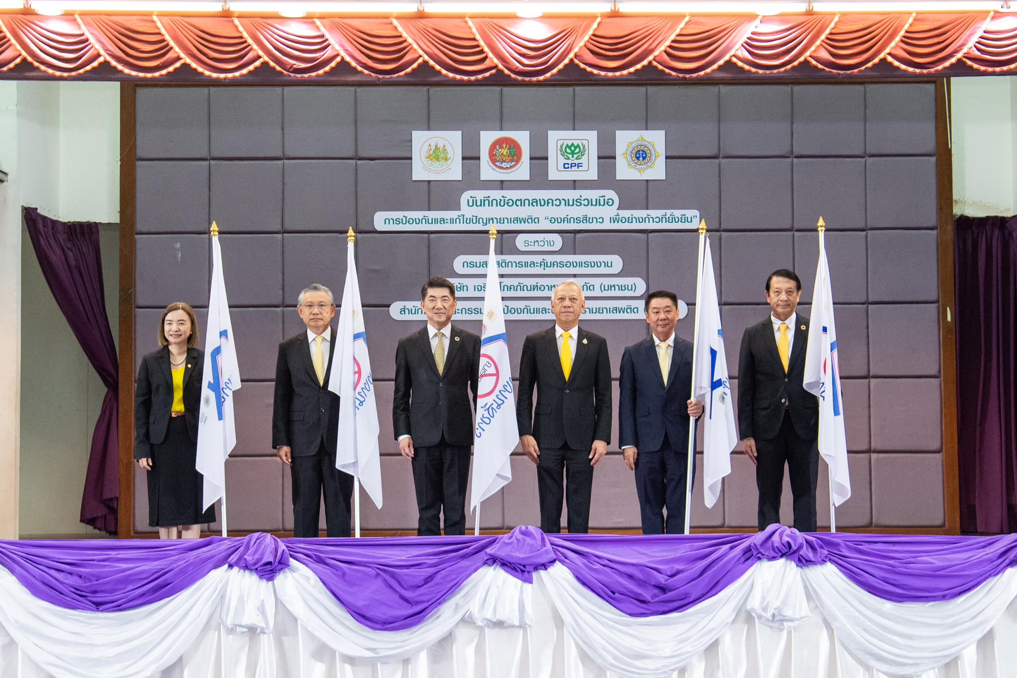 คุณพิพัฒน์ รัชกิจประการ รมว.แรงงาน เป็นประธานในพิธีลงนามความร่วมมือการป้องกันและแก้ไขปัญหายาเสพติด “องค์กรสีขาว เพื่อย่างก้าวที่ยั่งยืน” ระหว่าง กรมสวัสดิการและคุ้มครองแรงงาน สำนักงานคณะกรรมการป้องกันและปราบปรามยาเสพติด (ปปส.) และ ซีพีเอฟ พร้อมมอบธงนำร่องสถานประกอบกิจการ ผ่านเกณฑ์โรงงานสีขาวและมาตรฐานการป้องกันและแก้ไขปัญหายาเสพติดในสถานประกอบกิจการ (มยส.) แก่ คุณประสิทธิ์ บุญดวงประเสริฐ ประธานคณะผู้บริหาร ซีพีเอฟ และผู้บริหาร ซีพีเอฟ โดยมี คุณโสภา เกียรตินิรชา อธิบดีกรมสวัสดิการและคุ้มครองแรงงาน ผู้บริหารกระทรวงฯ ร่วมด้วย ณ ก.แรงงาน