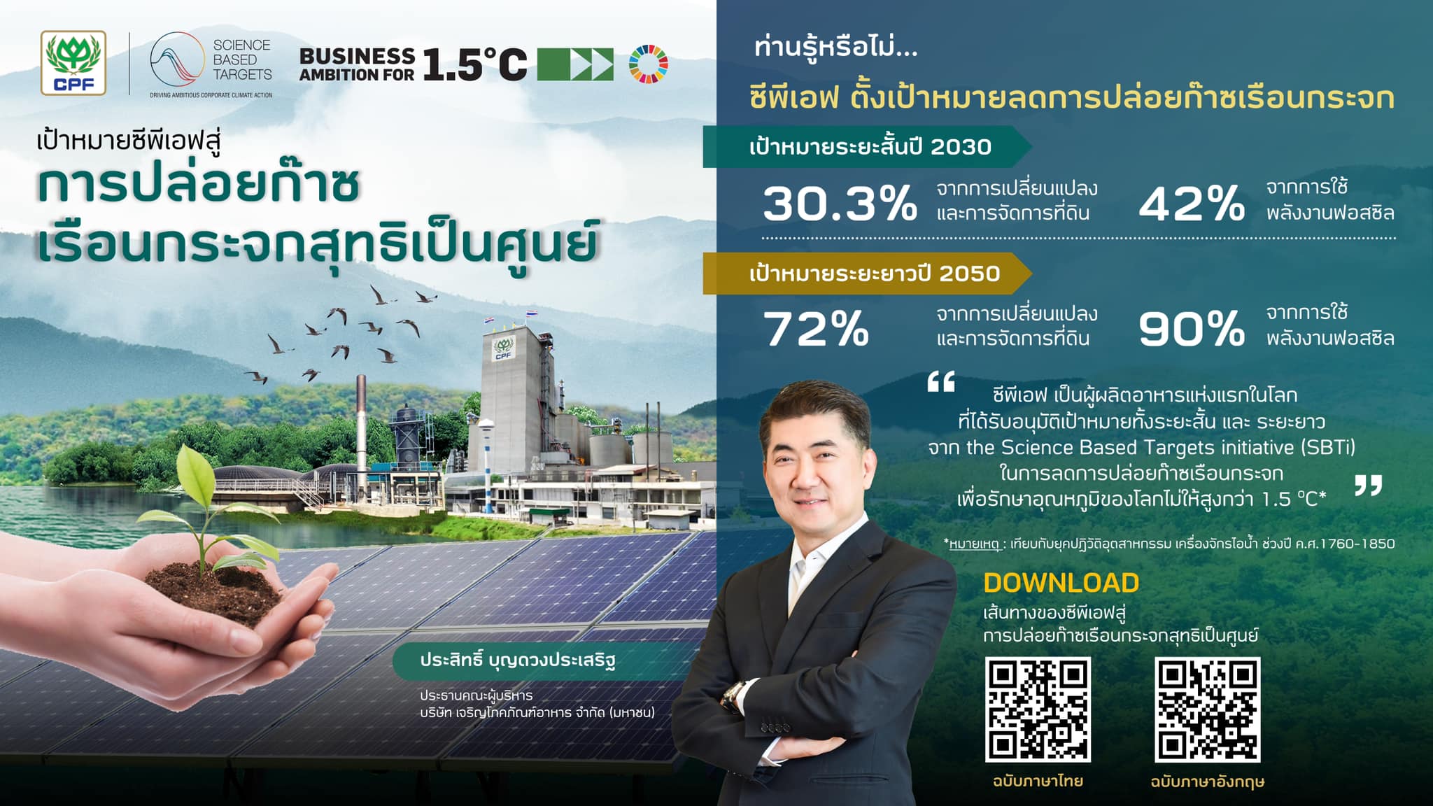 เพื่อให้บรรลุเป้าหมายของซีพีเอฟ มุ่งสู่การเป็น ‘ครัวของโลกที่ยั่งยืน’  ซีพีเอฟเป็นบริษัทผลิตอาหารบริษัทแรกในโลกที่ได้รับอนุมัติทั้งเป้าหมายระยะสั้นและระยะยาว สอดคล้องตามมาตรฐาน Forest, Land and Agriculture (FLAG) ซึ่งเป็นมาตรฐานเฉพาะสำหรับภาคเกษตรและอาหาร จากองค์กร the Science Based Targets initiative (SBTi) การประยุกต์ใช้โซลูชันด้านความยั่งยืนของ เอสเอพี เพื่อบันทึก รายงาน และดำเนินการกับข้อมูลด้านความยั่งยืนแบบเรียลไทม์ จะสามารถช่วยในการขับเคลื่อนการบัญชีคาร์บอน ทั้งในระดับองค์กรและผลิตภัณฑ์ ทั้งนี้ ซีพีเอฟ มุ่งมั่นที่จะบรรลุเป้าหมายการปล่อยก๊าซเรือนกระจกสุทธิเป็นศูนย์ (Net-Zero)  ด้วยการลดการปล่อยก๊าซเรือนกระจกขอบเขต 1 และ 2 ลง 42% และขอบเขตที่ 3 ลง 30.3% ให้ได้ภายในปี พ.ศ. 2573  และภายในปี พ.ศ. 2593 บริษัทมุ่งมั่นที่จะลดการปล่อยก๊าซขอบเขต 1 และ 2 ลง 90% และขอบเขต 3 ลง 72%