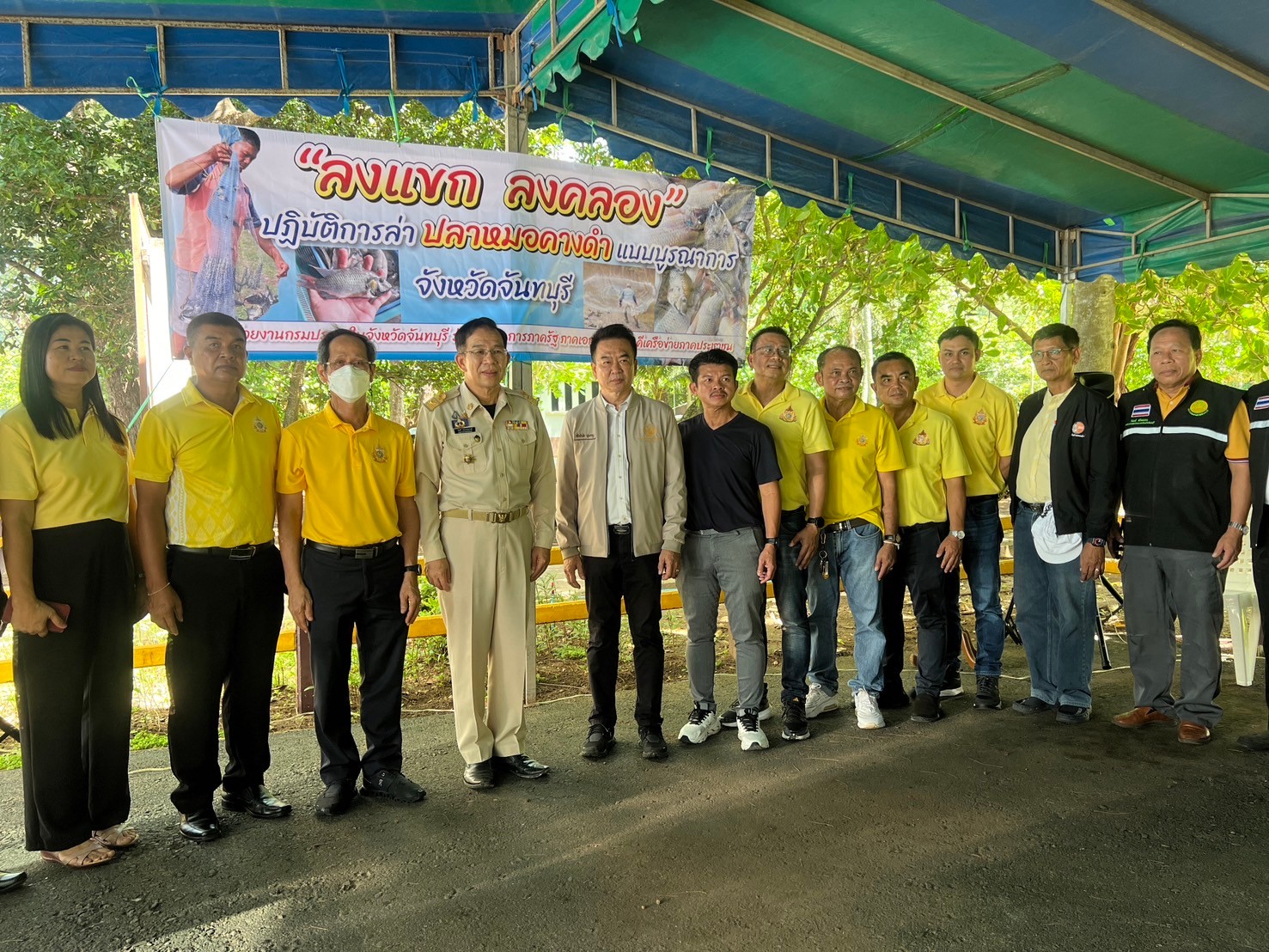 ที่บริเวณด้านหน้าอาคารแสดงพันธุ์สัตว์เฉลิมพระเกียรติอ่าวคุ้งกระเบน นายวิสุทธิ์ ประกอบความดี รองผู้ว่าราชการจังหวัดจันทบุรี เป็นประธานเปิดกิจกรรม “ลงแขก ลงคลอง…ล่าปลาหมอคางดำ โดยมี นายสมพร รุ่งกำเนิดวงศ์ ประมงจังหวัดจันทบุรี พร้อมด้วย หน่วยงานประมงในจังหวัดจันทบุรี ภาครัฐ ภาคเอกชน รวมถึงภาคีเครือข่ายอาสาสมัครพิทักษ์ทรัพยากรธรรมชาติและสิ่งแวดล้อมจังหวัดจันทบุรี เครือข่ายประมงพื้นบ้าน และทีมล่าปลาหมอคางดำร่วมกิจกรรมประมาณ 200 คน โดยมี ซีพีเอฟ นำพนักงานจิตอาสา ร่วมสนับสนุนอุปกรณ์การจับปลา ช่วยเตรียมอาหารกลางวัน และน้ำดื่มให้กับผู้ร่วมกิจกรรมอีกด้วย