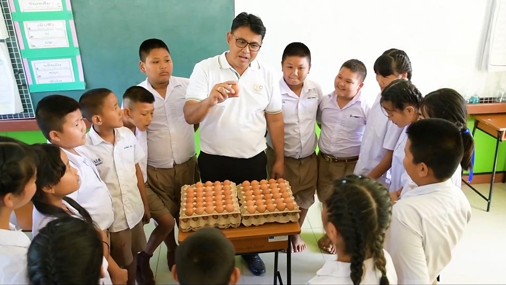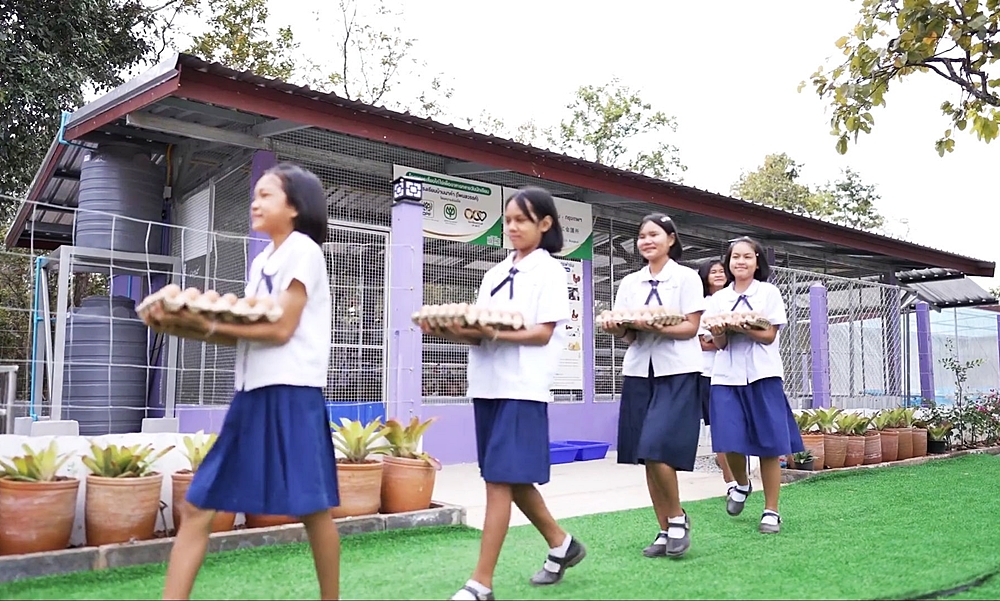 ไข่ไก่ที่ผลิตได้ ไม่ใช่เพียงวัตถุดิบสำคัญในโครงการอาหารกลางวันเท่านั้น แต่ไข่ส่วนที่เหลือยังนำไปจำหน่ายให้กับพ่อแม่ผู้ปกครองและคนในชุมชน กลายเป็นคลังอาหารของชุมชนแบบยั่งยืน ถือเป็นการสร้างความมั่นคงด้านอาหารให้ทั้งโรงเรียนและชุมชน ปัจจุบัน มีโรงเรียนเข้าร่วมโครงการนี้แล้วถึง 988 แห่ง ทั่วประเทศ เด็กๆ กว่า 223,000 คน และคุณครูอีก กว่า 16,500 คน ได้รับประโยชน์จากโครงการฯ