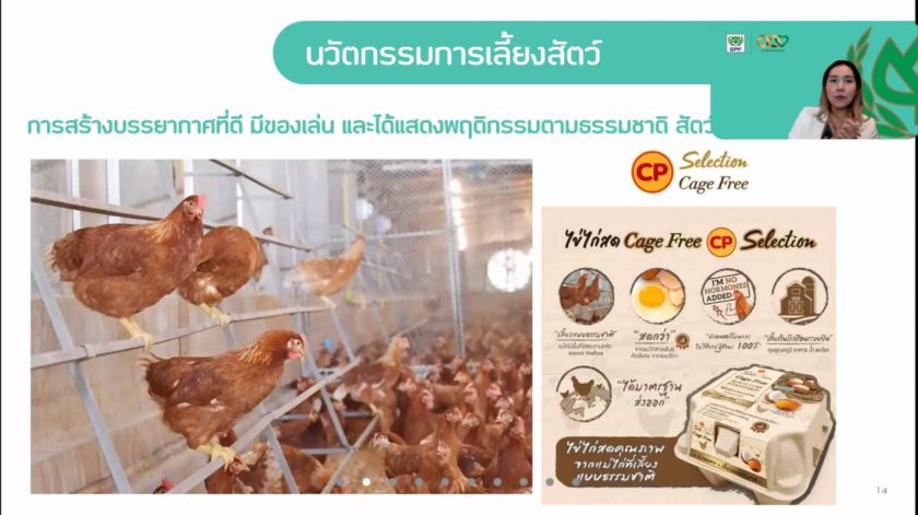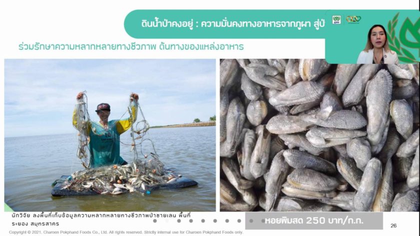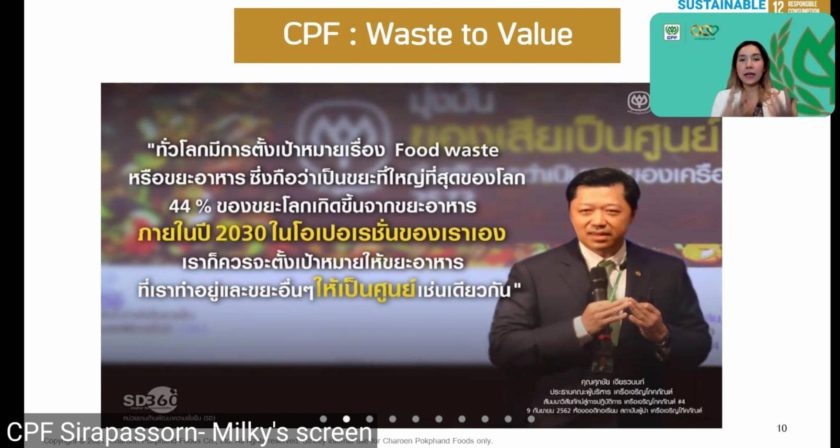 คุณศิรภัสสร สกุลวิวรรธน์ ผู้ช่วยกรรมการผู้จัดการ หน่วยงานความรับผิดชอบต่อสังคมและการพัฒนาอย่างยั่งยืน CPF เป็นผู้แทนบริษัทฯ เสนอแนวคิดการต่อยอดนวัตกรรมและการสร้างเครือข่ายพันธมิตรในหัวข้อ “CPF การขับเคลื่อนความมั่นคงในระบบอาหารที่ยั่งยืน” เน้นย้ำการขับเคลื่อนธุรกิจด้วยความรับผิดชอบต่อสังคมและใส่ใจสมดุลสิ่งแวดล้อม ภายใต้กลยุทธ์ความยั่งยืนใหม่ 3 เสาหลัก ประกอบด้วย อาหารมั่นคง สังคมพึ่งตน และดิน น้ำ ป่า คงอยู่ เพราะการผลิตอาหารมั่นคงมาจากความสมบูรณ์ของสิ่งแวดล้อม