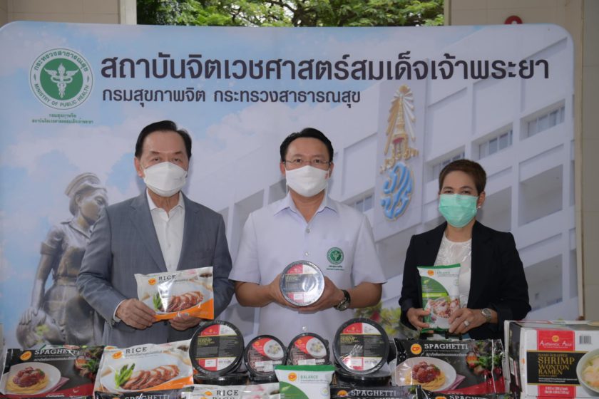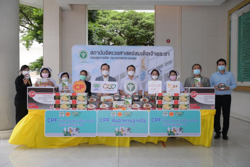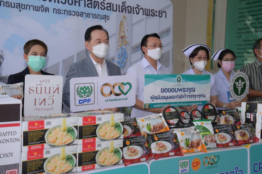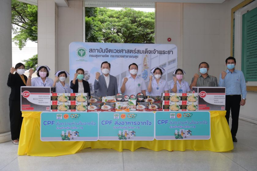 นพ.ธรณินทร์ กองสุข ผอ.สถาบันจิตเวชศาสตร์สมเด็จเจ้าพระยา รับมอบอาหารสำเร็จรูปพร้อมทานหลากหลายเมนู จาก CPF ในโครงการ “CPF ส่งอาหารจากใจ ร่วมต้านภัยโควิด-19” ตามนโยบายเครือเจริญโภคภัณฑ์ เพื่อแทนคำขอบคุณบุคลากรด้านสาธารณสุข อาสาสมัคร และจิตอาสาที่เสียสละดูแลผู้ป่วยจิตเวชที่ติดเชื้อโควิด โดยมี คุณวรวิทย์ เจนธนากุล รองกรรมการผู้จัดการบริหาร และ คุณพรรณินี นันทพานิช รองกรรมการผู้จัดการอาวุโส ด้านสื่อสารองค์กรและประชาสัมพันธ์ CPF เป็นผู้แทนบริษัทฯ มอบ