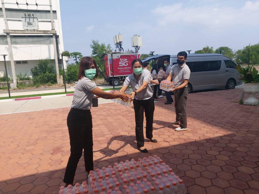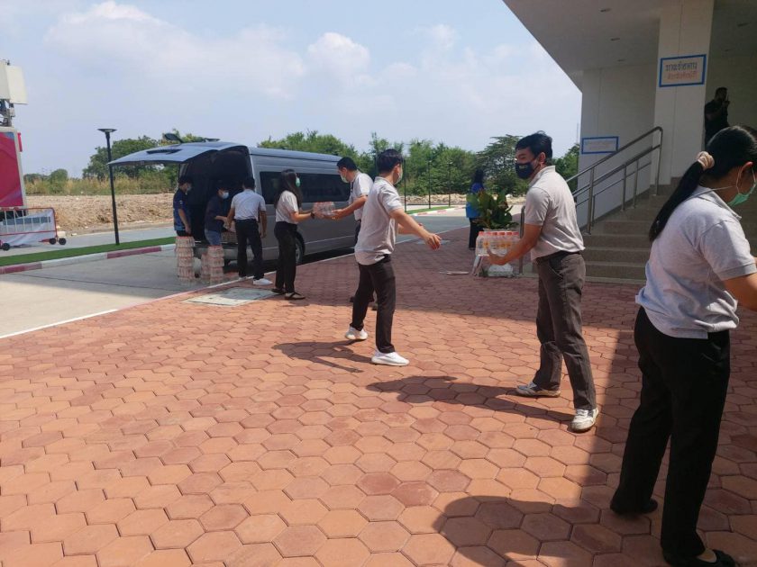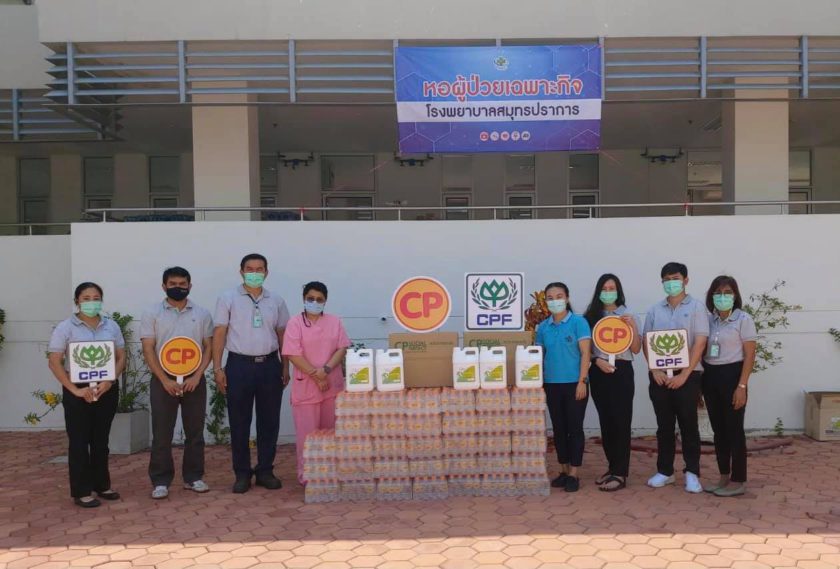 คุณนิธิพงศ์ นงค์นาค ผู้ช่วยกรรมการผู้จัดการ และพนักงาน CPF โรงงานผลิตอาหารสัตว์บางนา กม.21 เป็นผู้แทนบริษัทฯ เดินหน้าโครงการ “CPF ส่งอาหารจากใจ ร่วมต้านภัยโควิด-19” อย่างต่อเนื่อง ร่วมมอบน้ำดื่มซีพี 1,200 ขวด, หน้ากากอนามัย 2,000 ชิ้น และแอลกอฮอล์ 5 แกลลอน ให้กับ รพ.สนามสมุทรปราการ เพื่อเป็นกำลังใจและสนับสนุนการปฏิบัติภารกิจของเจ้าหน้าที่ในการป้องกันและเฝ้าระวังการแพร่ระบาดของโควิด-19 รอบใหม่ โดยมี คุณชลธิชา รักษาธรรม พยาบาลวิชาชีพ รพ.สมุทรปราการ รับมอบ