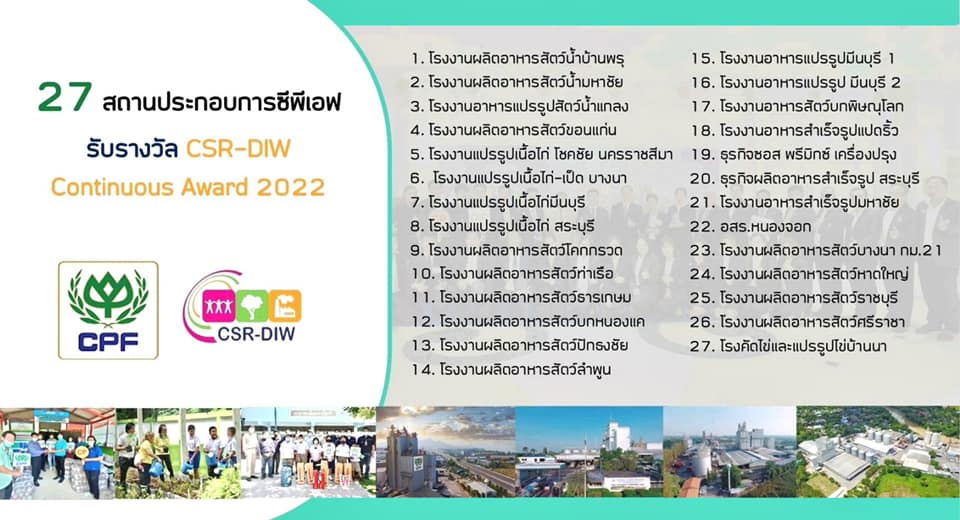 สำหรับสถานประกอบการ 27 แห่ง ที่ได้รับรางวัล CSR-DIW Continuous Award 2022 ได้แก่ โรงงานผลิตอาหารสัตว์น้ำบ้านพรุ, โรงงานผลิตอาหารสัตว์น้ำมหาชัย, โรงงานอาหารแปรรูปสัตว์น้ำแกลง, โรงงานผลิตอาหารสัตว์ขอนแก่น, โรงงานแปรรูปเนื้อไก่โชคชัย นครราชสีมา, โรงงานแปรรูปเนื้อไก่-เป็ด บางนา, โรงงานแปรรูปเนื้อไก่มีนบุรี, โรงงานแปรรูปเนื้อไก่ สระบุรี, โรงงานผลิตอาหารสัตว์โคกกรวด, โรงงานผลิตอาหารสัตว์ท่าเรือ, โรงงานผลิตอาหารสัตว์ธารเกษม, โรงงานผลิตอาหารสัตว์บกหนองแค, โรงงานผลิตอาหารสัตว์ปักธงชัย, โรงงานผลิตอาหารสัตว์ลำพูน, โรงงานอาหารแปรรูปมีนบุรี 1, โรงงานอาหารแปรรูป มีนบุรี 2, โรงงานอาหารสัตว์บกพิษณุโลก, โรงงานอาหารสำเร็จรูปแปดริ้ว, ธุรกิจซอส พรีมิกซ์ เครื่องปรุง, ธุรกิจผลิตอาหารสำเร็จรูป สระบุรี, โรงงานอาหารสำเร็จรูปมหาชัย, อสร.หนองจอก, โรงงานผลิตอาหารสัตว์บางนา กม. 21, โรงงานผลิตอาหารสัตว์หาดใหญ่, โรงงานผลิตอาหารสัตว์ราชบุรี, โรงงานผลิตอาหารสัตว์ศรีราชา และโรงคัดไข่และแปรรูปไข่บ้านนา