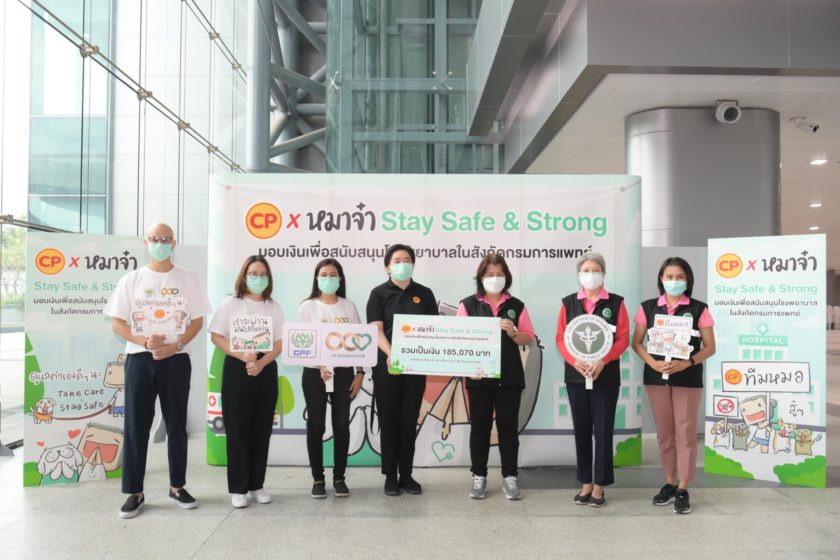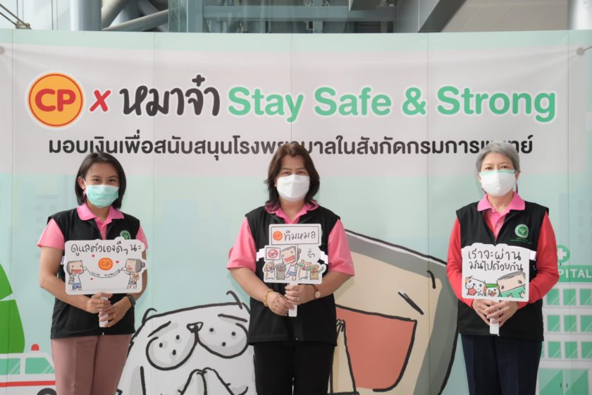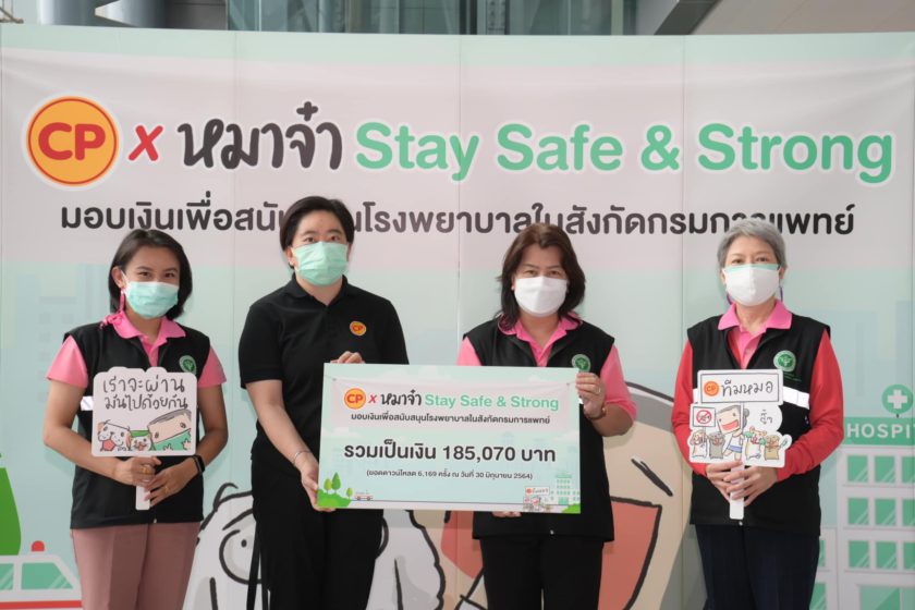 คุณศิริลักษณ์ อุบลเหนือ รองผู้อำนวยการด้านอำนวยการ พร้อมด้วย พญ.พู่กลิ่น ตรีสุโกศล รองผู้อำนวยการด้านการแพทย์ สถาบันโรคผิวหนัง กรมการแพทย์ รับมอบเงินสนับสนุน 185,070 บาท จากการชวนคนไทยใจบุญ โหลดสติ๊กเกอร์ไลน์ “CP x หมาจ๋า Stay Safe & Strong” เพื่อมอบให้แก่โรงพยาบาลในสังกัดกรมการแพทย์ ก.สาธารณสุข ซื้ออุปกรณ์ทางการแพทย์ในการรักษาผู้ป่วยโควิด-19 โดยมี คุณสุชาดา วีระเมธีกุล ผู้ช่วยกรรมการผู้จัดการ และชาว CPF จิตอาสา ร่วมมอบ
