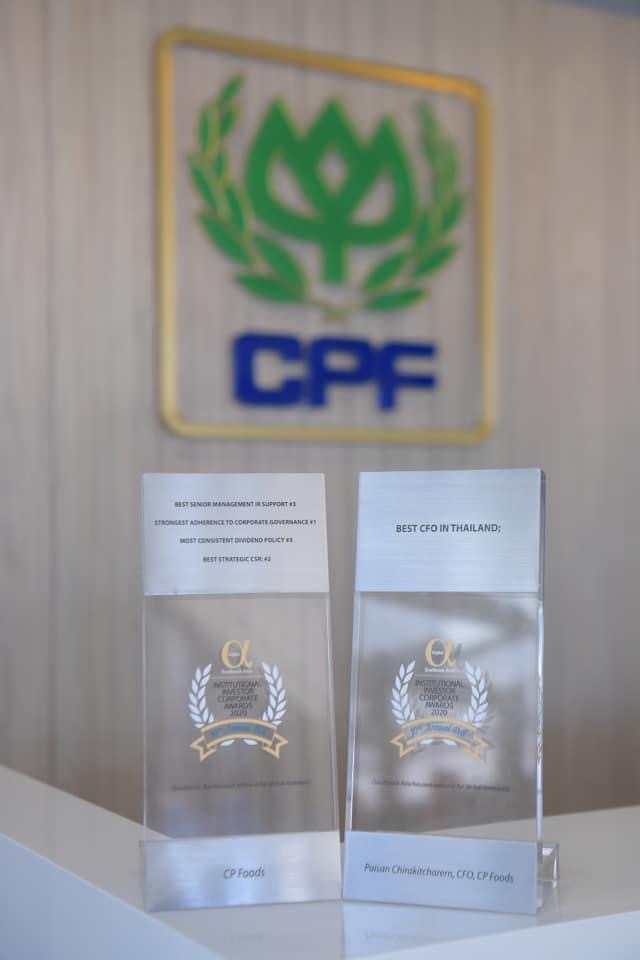 CPF ผู้นำธุรกิจเกษตรอุตสากรรมและอาหารระดับโลก คว้า 4 รางวัล จากงาน 10th Annual Institutional Investor Awards for Corporates ซึ่งจัดขึ้นเป็นปีที่ 10 โดย Alpha Southeast Asia นิตยสารการเงินชั้นนำในภูมิภาคเอเชียตะวันออกเฉียงใต้ จากการโหวตของผู้อ่านให้เป็นบริษัทยอดเยี่ยมของไทย ได้แก่ รางวัลการสนับสนุนทีมนักลงทุนสัมพันธ์จากฝ่ายบริหารอาวุโสดีที่สุด (Best Senior Management IR Support), รางวัลความแข็งแกร่งของการจัดการด้านบรรษัทภิบาล (Strongest Adherence to Corporate Governance), รางวัลนโยบายจ่ายเงินปันผลที่สม่ำเสมอ (Most Consistent Dividend Policy) และรางวัลกลยุทธ์ความรับผิดชอบต่อสังคม (Best Strategic CSR)