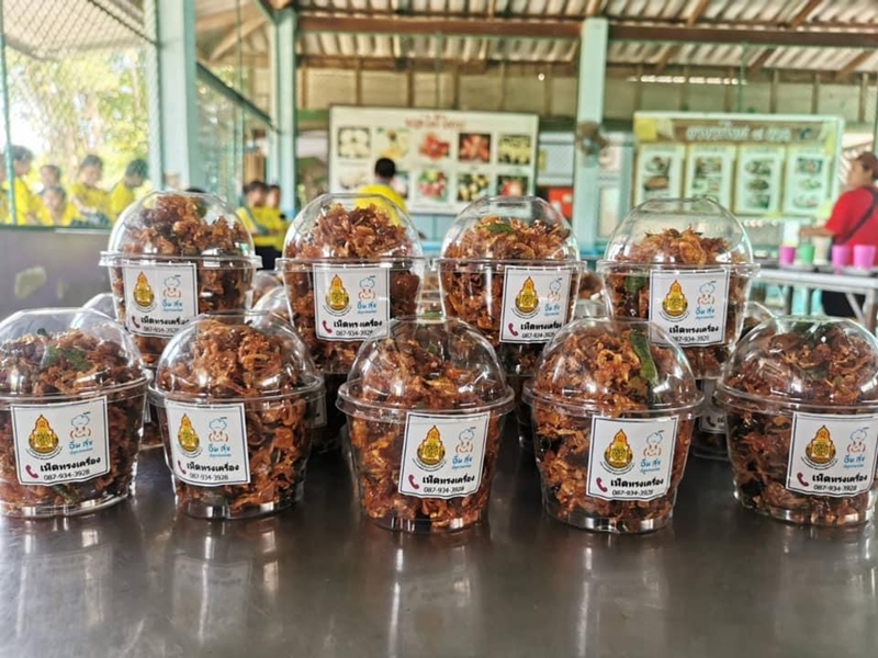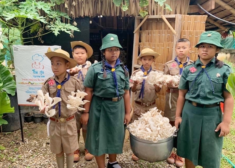 นอกจากนี้ เด็กๆ ยังได้เรียนรู้การบริหารจัดการผลผลิตไม่ให้เหลือทิ้ง หรือนำผลผลิตเห็ดที่เหลือมาแปรรูปอาหาร สร้างมูลค่าเพิ่มของผลิตภัณฑ์ มีทั้ง เมนูเห็ดสวรรค์ เห็ดนรก และน้ำพริกเห็ด จำหน่ายกระปุกเล็ก กระปุกละ 20 บาท และกระปุกใหญ่ 3 กระปุก ราคา 100 บาท ซึ่งรายได้จากการจำหน่ายผลิตภัณฑ์จะนำมาใช้ต่อยอดกิจกรรมและโครงการต่างๆ ให้เกิดความยั่งยืนของโครงการต่อไป
