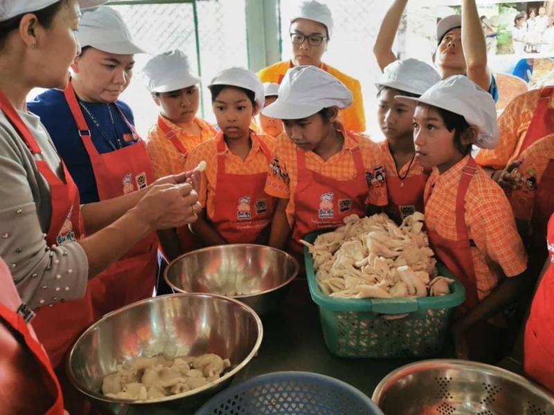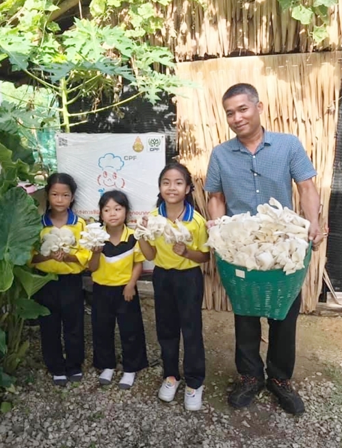 คุณครูกุลชญา ชั้นเล็ก หรือคุณครูเอ็ม ผู้รับผิดชอบโครงการปลูกผัก เพาะเห็ด เลี้ยงไก่ไข่และแปรรูปอาหาร เล่าว่า เด็กๆ ได้เรียนรู้ทักษะอาชีพจากการลงมือปฏิบัติจริงและนำไปใช้ได้จริง จากสถานีการเรียนรู้ทั้ง 5 สถานี ซึ่งมี CPF และหน่วยงานในพื้นที่สนับสนุน หลังจากที่เปิดภาคการศึกษาใหม่ CPF ได้นำก้อนเชื้อเห็ดชุดใหม่ 1,000 ก้อน ทดแทนก้อนเชื้อชุดเดิมที่หมดเชื้อและไม่ออกผลผลิตแล้ว รวมทั้งเข้ามาซ่อมแซมโรงเรือนเพาะเห็ดให้อยู่ในสภาพที่พร้อมใช้งาน