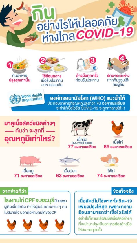 อย่างไรก็ตาม มีข้อมูลเพิ่มเติมจาก ศ.นพ.ยง ภู่วรรวรรณ หัวหน้าศูนย์เชี่ยวชายเฉพาะทางด้านไวรัสวิทยาคลินิก คณะแพทยศาสตร์ จุฬาลงกรณ์มหาวิทยาลัย ยืนยันไว้ก่อนหน้านี้ว่า มีงานวิจัยชี้ชัดว่าไวรัสตัวนี้ไม่ติดในหมู ไก่ เป็ด หรือปศุสัตวือื่นๆ ประชาชนสบายใจได้ในการบริโภคเนื้อสัตว์เหล่านี้ แต่ขอเน้นย้ำว่าต้องปรุงให้สุก สะอาด ไม่แนะนำให้ทานอาหารสุกๆ ดิบๆ ในช่วงนี้เด็ดขาด การทานอาหารที่ปรุงสุกความร้อนจะฆ่าไวรัวได้ทุกชนิดรวมทั้งโควิด-19