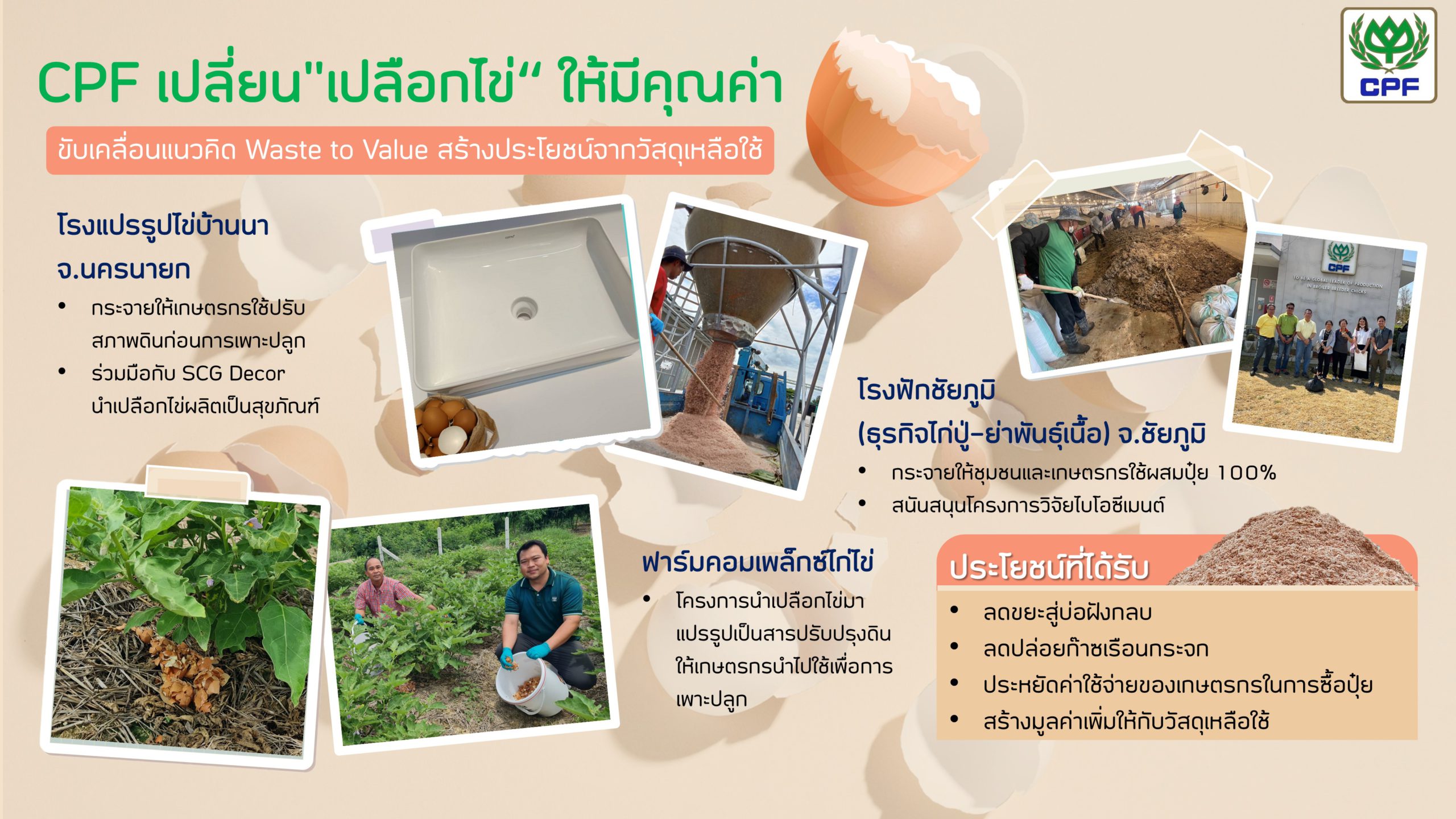 โรงงานแปรรูปไข่บ้านนา จังหวัดนครนายก นำเปลือกไข่บดที่เหลือจากกระบวนการผลิต แบ่งปันให้เกษตรกรในพื้นที่นำไปใช้ปรับดินก่อนการเพาะปลูก จากการที่คุณสมบัติของเปลือกไข่ที่ช่วยให้ดินร่วนซุย โดยในละปีมีเปลือกไข่บดเฉลี่ยที่ให้กับเกษตรกร 1,800 ตันต่อปี และในปีนี้ ยังได้ร่วมมือกับ บริษัท เอสซีจี เดคคอร์ จำกัด (มหาชน) หรือ SCG Decor (SCGD) สนับสนุนเปลือกไข่ในการวิจัย และพัฒนาสินค้าสุขภัณฑ์ ภายใต้แบรนด์ COTTO โดยเน้นการใช้ทรัพยากรให้เกิดประโยชน์สูงสุด และลดการปล่อยก๊าซเรือนกระจก ด้วยการนำเปลือกไข่จากโรงงานแปรรูปไข่บ้านนา จ.นครนายก และโรงฟักแก่งคอย จ.สระบุรี มาใช้ประโยชน์เชิงอุตสาหกรรม