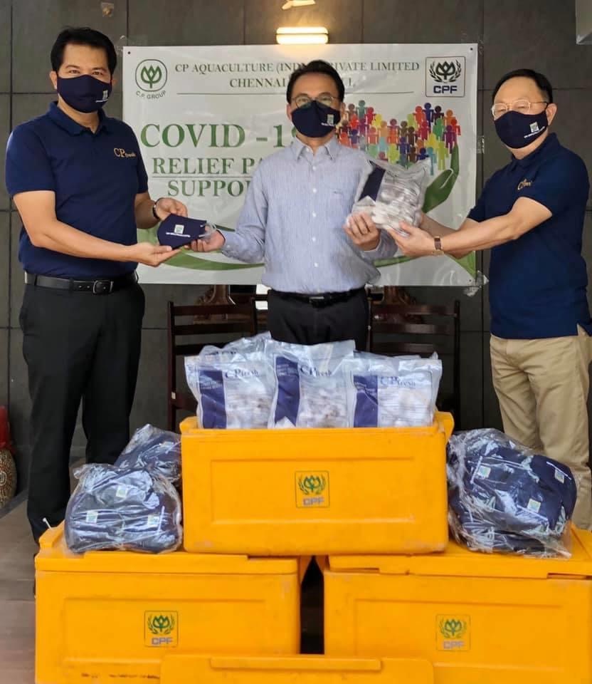 คุณนิธิรุจน์ โผนประเสริฐ กงสุลใหญ่ ณ เมืองเจนไน ประเทศอินเดีย (Mr. Nitirooge Phoneprasert, Consul-General) รับมอบกุ้งแช่แข็ง ตรา CP Flesh มาตรฐานส่งออก พร้อมหน้ากากผ้า จาก CPF อินเดีย ในโครงการ “CPF ส่งอาหารจากใจ ร่วมต้านภัยโควิด-19” เพื่อใช้ประกอบอาหารบรรเทาความเดือดร้อนให้คนไทยที่เตรียมเดินทางกลับประเทศ รวมถึงชาวอินเดียในเมืองเจนไน ประเทศอินเดีย หลังได้รับผลกระทบจากสถานการณ์โควิด-19 โดยมี คุณอรุณ นฤมิตเลิศ, คุณประเสริฐ สุวรรณ รองกรรมการผู้จัดการอาวุโส และ คุณจักรกฤษณ์ ทนันต์ชัย ผู้จัดการทั่วไป เป็นตัวแทนมอบ