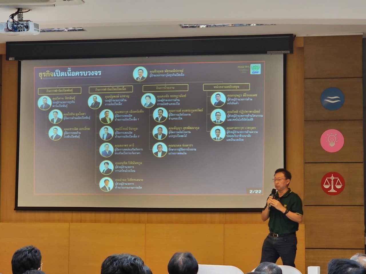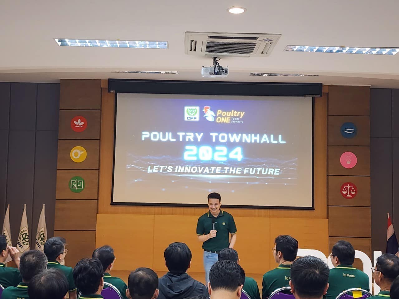 คุณภาณุวัตร เนียมเปรม ผู้อำนวยการใหญ่ ธุรกิจไก่เนื้อเป็ดเนื้อครบวงจร CPF เปิดงาน ‘POULTRY TOWNHALL 2024’ ภายใต้แนวคิด ‘Let’s Innovate the Future’ ร่วมออกแบบและสร้างอนาคต CPF ให้เติบโตไปด้วยกัน พร้อมแสดงวิสัยทัศน์และกลยุทธ์การดำเนินธุรกิจของบริษัทฯ ตามนโยบายของท่านประธานอาวุโสธนินท์ เจียรวนนท์ และ CEO ประสิทธิ์ บุญดวงประเสริฐ ตลอดจนความท้าทายและทิศทางการดำเนินงานธุรกิจไก่เนื้อ-เป็ดเนื้อครบวงจร ปี 2024 โดยมี ผู้บริหารและพนักงาน กว่า 400 คน ร่วมด้วย ณ ศูนย์การเรียนรู้สีคิ้ว และ ทาง Online
