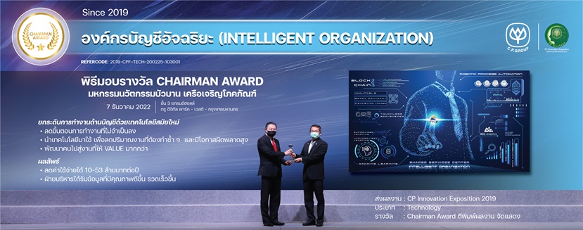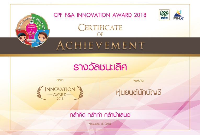 ก่อนหน้านั้น ในปี 2018 Shared Services Center ซีพีเอฟ ได้รับรางวัลชนะเลิศ CPF F&A INNOVATION Award 2018 สาขา INNOVATION AWARD จากผลงาน “หุ่นยนต์นักบัญชี” และได้นำผลงานจัดแสดง INVITED PAVILION : Technology และร่วมนำเสนอผลงานวิชาการ ภายในงาน CP Innovation Exposition มหกรรมนวัตกรรมบัวบาน เครือเจริญโภคภัณฑ์ 2019 ซึ่งเป็นศูนย์รวมการผลิตผลงานวิทยาศาสตร์ เทคโนโลยี และด้านอื่นๆ ที่ทรงคุณค่าของพนักงานจากกลุ่มธุรกิจทั่วโลก