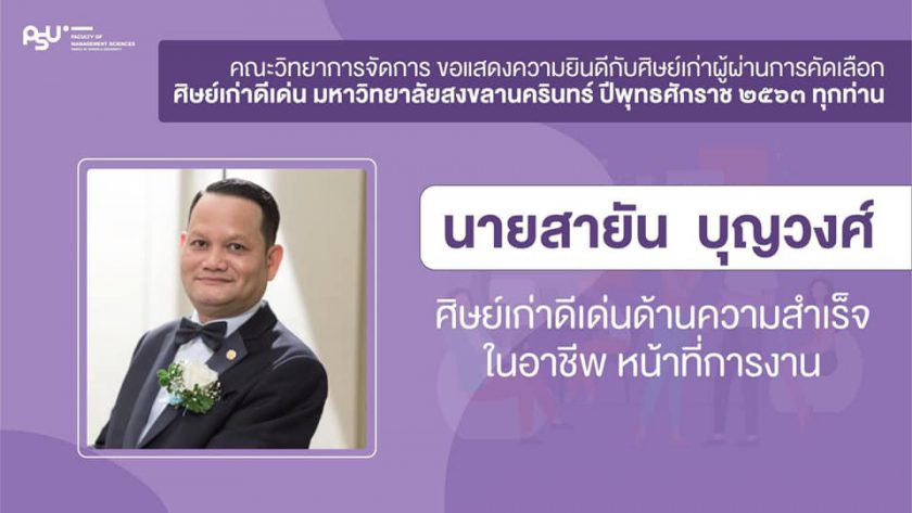 คุณสายัน บุญวงค์ รองกรรมการผู้จัดการอาวุโส ด้านบัญชีการเงิน เขตประเทศรัสเซีย CPF รัสเซีย รับรางวัลศิษย์เก่าดีเด่น ด้านความสำเร็จในอาชีพหน้าที่การงาน จากคณะวิทยาการจัดการ มหาวิทยาลัยสงขลานครินทร์