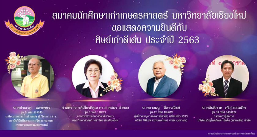 ขณะที่ คุณสันติภาพ ศรีสุวรรณภิพ กรรมการผู้จัดการ CP มาเลเซีย และ คุณดวงมนู ลีลาวณิชย์ รองกรรมการผู้จัดการอาวุโส ผู้เชี่ยวชาญการจัดการสัตว์ปีก CPF รับรางวัลศิษย์เก่าดีเด่น จากสมาคมนักศึกษาเก่าเกษตรศาสตร์ มหาวิทยาลัยเชียงใหม่