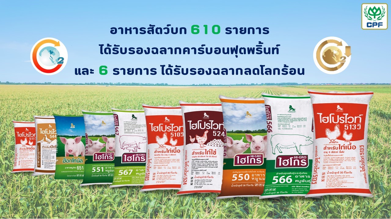 ปัจจุบัน ผลิตภัณฑ์ของซีพีเอฟ มากกว่า 790 รายการ มีการประเมินคาร์บอนฟุตพริ้นท์ และมากกว่า 30 รายการ เป็นผลิตภัณฑ์คาร์บอนต่ำที่ได้รับรองฉลากลดโลกร้อนจากองค์การบริหารจัดการก๊าซเรือนกระจก (องค์การมหาชน) หรือ อบก. ได้แก่ อาหารไก่เนื้อ ไก่ เป็ด และ สุกรขุนมีชีวิต ผลิตภัณฑ์เนื้อไก่ เนื้อเป็ด และหมูสด เป็นผลจากการพัฒนาประสิทธิภาพในกระบวนการผลิตอย่างสม่ำเสมอ ตั้งแต่การวิจัยและพัฒนาอาหารสัตว์ ให้มีโภชนาการที่เหมาะสมกับการเติบโตแต่ละช่วงวัย และการลดการสูญเสียอาหาร (Food Loss) ในกระบวนการผลิต การเพิ่มประสิทธิภาพการใช้พลังงาน การใช้พลังงานหมุนเวียนในการผลิต และการเลือกใช้บรรจุภัณฑ์ยั่งยืน ทำให้ได้ห่วงโซ่การผลิตผลิตภัณฑ์คาร์บอนต่ำ ซึ่งมีการปล่อยก๊าซเรือนกระจกลดลงอย่างต่อเนื่อง