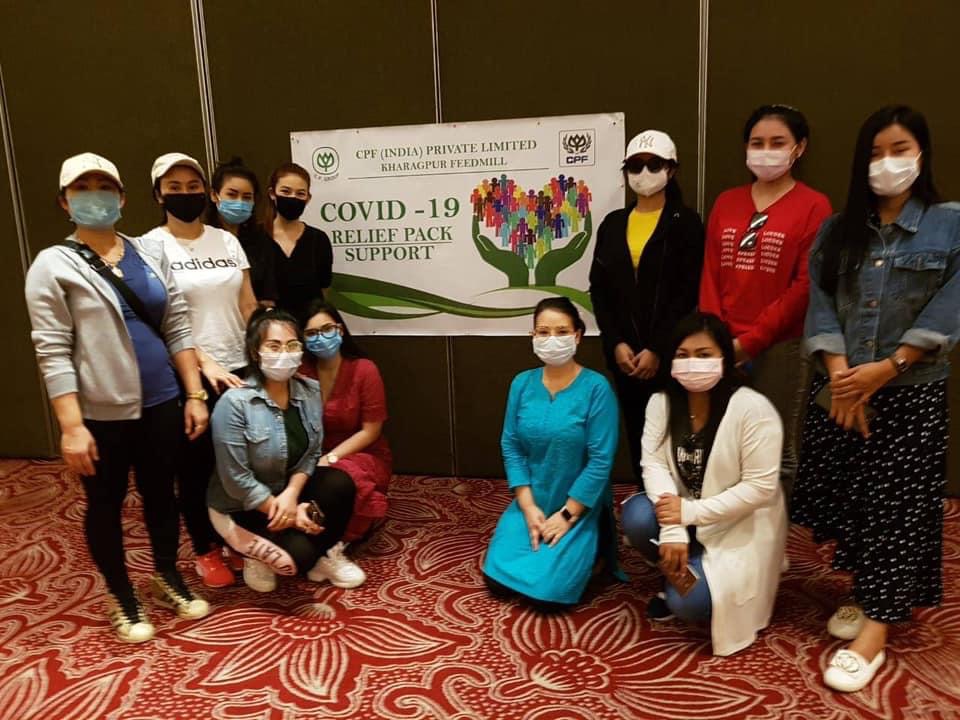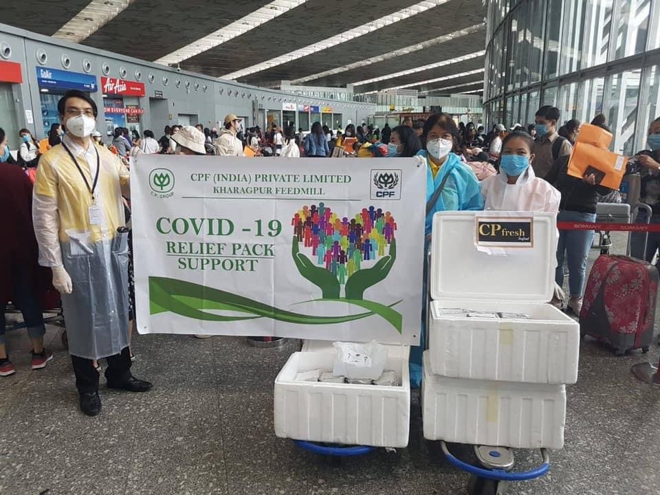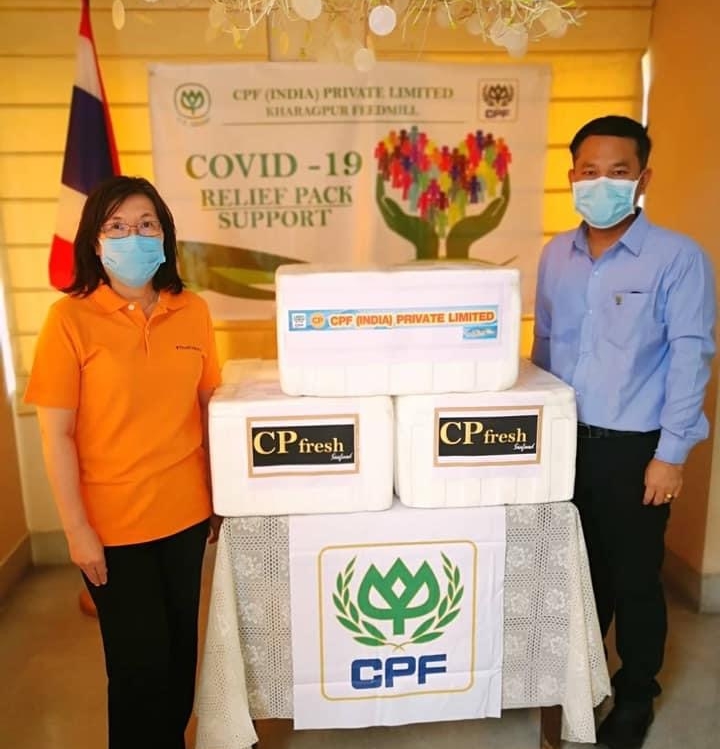 คุณสวียา สันติพิทักษ์ กงสุลใหญ่ ณ เมืองกัลกัตตา อินเดีย รับมอบผลิตภัณฑ์กุ้งแช่แข็งมาตรฐานส่งออก CP Fresh Select ด้วยระบบการเลี้ยง CPF Smart Farm จาก CPF อินเดีย ในโครงการ “CPF ส่งอาหารจากใจ ร่วมต้านภัยโควิด-19” เพื่อสนับสนุนภารกิจช่วยเหลือคนไทย จำนวน 213 คน ที่ตกค้างในอินเดีย เดินทางกลับสู่ประเทศไทยด้วยเที่ยวบินพิเศษ ณ ท่าอากาศยานนานาชาติเนตรชี สุภาส จันทระ โพส เมืองกัลกัตตา รัฐเบงกอลตะวันตก ประเทศอินเดีย โดยมี คุณอำนาจ ลังเดช รองกรรมการอาวุโส และ คุณวสันต์ แก้วแสน ผู้ช่วยกรรมการผู้จัดการ CPF อินเดีย เป็นตัวแทนมอบ