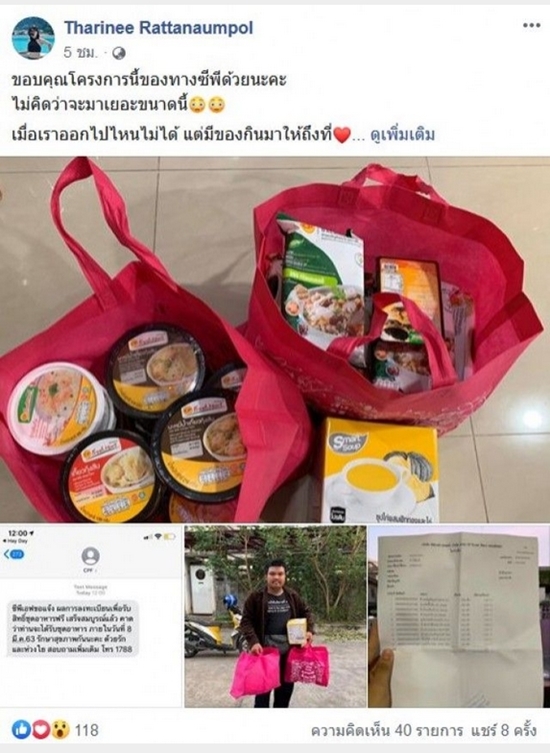 ซึ่งผู้ใช้เฟซบุ๊กคุณ Tharinee Rattanaumpol ซึ่งเป็นหนึ่งในผู้กักตัว และได้ลงทะเบียนรับสิทธิ์อาหารฟรีกับ CP Fresh Mart ได้ออกมาเผยภาพอาหารที่ได้รับ พร้อมระบุว่า