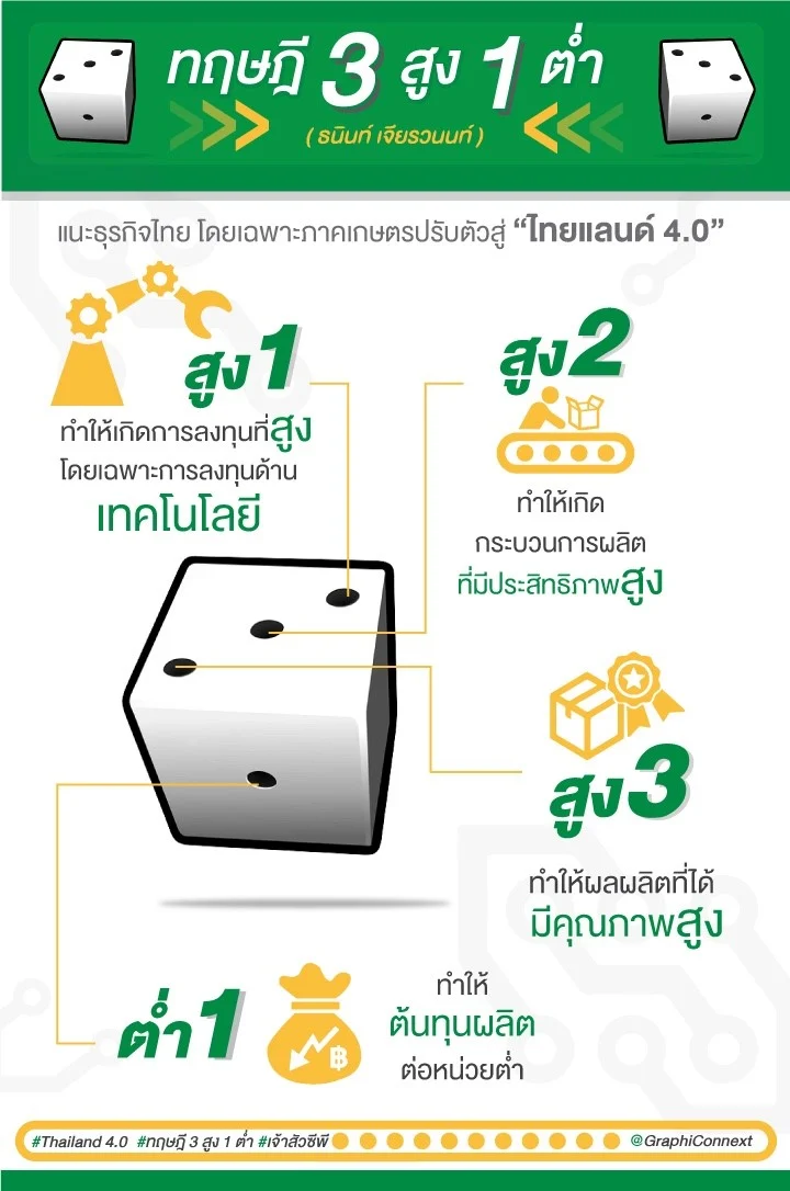 คุณธนินทร์ เจียรวนนท์ ประธานอาวุโส เครือเจริญโภคภัณฑ์ จำกัด เปิดเผยในงานสัมมนา Opportunity Thailand ว่า โลกกำลังก้าวไปสู่ยุค 4.0 ในทุกด้าน หลายธุรกิจจึงจำเป็นต้องปรับตัวโดยเฉพาะภาคเกษตรของไทยที่จะต้องดำเนินนโยบายไปสู่ 3 สูง 1 ต่ำ คือ ลงทุนสูงโดยเฉพาะด้านเทคโนโลยี ประสิทธิภาพสูง คุณภาพสูง และต้นทุนต่ำ