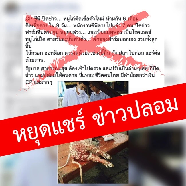 ข้อความเท็จ หมู-ไก่เป็นเอดส์ เรื่องที่ถูกส่งต่อมาตั้งแต่ปี 2551 และ พ.ศ.นี้วนกลับมาแชร์กันอีกในโลกโซเชียล หลังหลายฝ่ายออกโรงเตือน ขอให้หยุดโพสต์หยุดแชร์ข้อมูลมั่ว ผิดพ.ร.บ.คอมพ์ มีโทษหนัก ทั้งจำทั้งปรับ