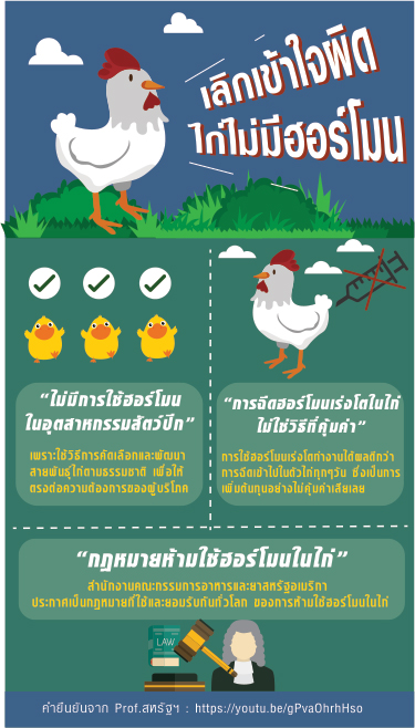 นอกจากนี้ นักวิชาการชาวอเมริกัน Dr.Susan E.Watkins จากศูนย์ความเป็นเลิศทางวิทยาศาสตร์สัตว์ปีกแห่งมหาวิทยาลัย Arkansas ระบุ “ไม่มีการใช้ฮอร์โมนเร่งโตในอุตสาหกรรมการเลี้ยงไก่ในสหรัฐฯ” ด้วยเหตุผล 3 ข้อ