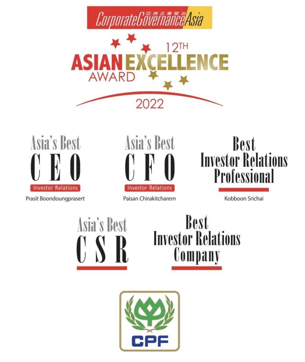 CPF รับ 5 รางวัลเกียรติยศด้านความเป็นเลิศแห่งภูมิภาคเอเชียประจำปี 2565 จากเวที The 12th Asian Excellence Awards 2022 จัดโดยนิตยสาร Corporate Governance Asia เป็นสื่อด้านการเงินที่มุ่งเน้นการกำกับกิจการที่ดีของฮ่องกงและเอเชีย สะท้อนศักยภาพองค์กรชั้นนำระดับสากลที่มีความเป็นเลิศในการดำเนินธุรกิจอย่างมีธรรมาภิบาล ดูแลสังคม และสิ่งแวดล้อม