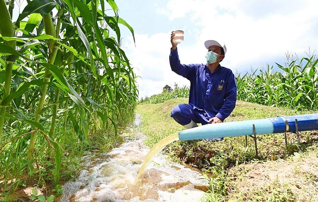 ขณะเดียวกัน น้ำหลังการบำบัดจากระบบไบโอแก๊ส นำไปใช้หมุนเวียนผสมกับมูลไก่ในระบบฯ โดยไม่จำเป็นต้องใช้น้ำดิบจากธรรมชาติ ส่วนกากไบโอแก๊สหลังการบำบัด มีเกษตรกรที่ขอไปใช้ประโยชน์ในการปรับสภาพดินก่อนที่จะปลูกพืช หรือทำนา ส่วนน้ำหลังการบำบัด เป็นน้ำที่มีแร่ธาตุเหมาะกับการเติบโตของพืช ส่งต่อให้เกษตรกรในพื้นที่ใกล้เคียงฟาร์ม นำไปใช้กับแปลงเพาะปลูก ช่วยให้ผลผลิตเติบโตได้ดี มีผลผลิตเพิ่มขึ้น และลดค่าใช้จ่ายในการซื้อปุ๋ยเคมี
