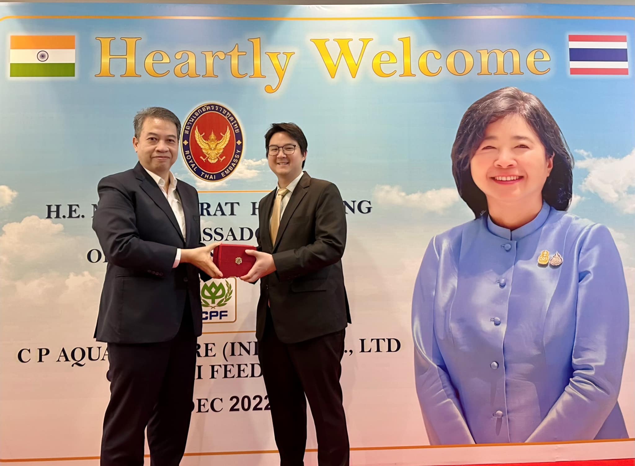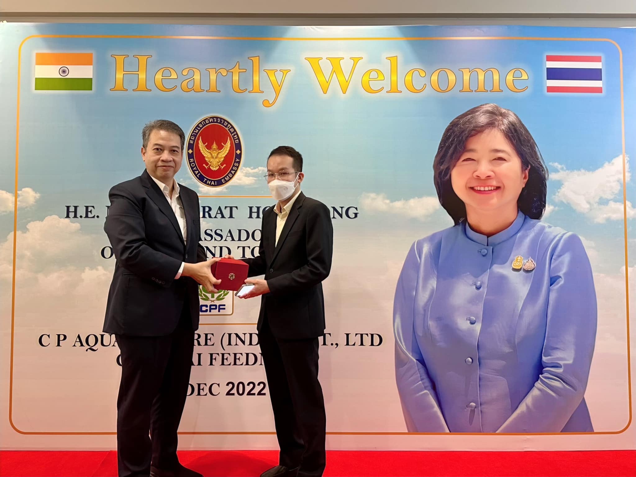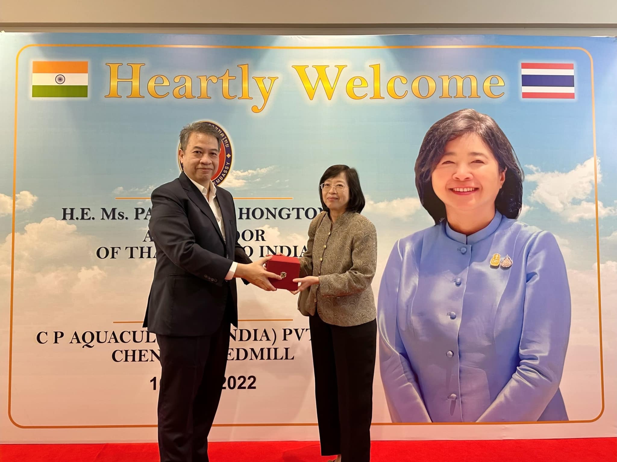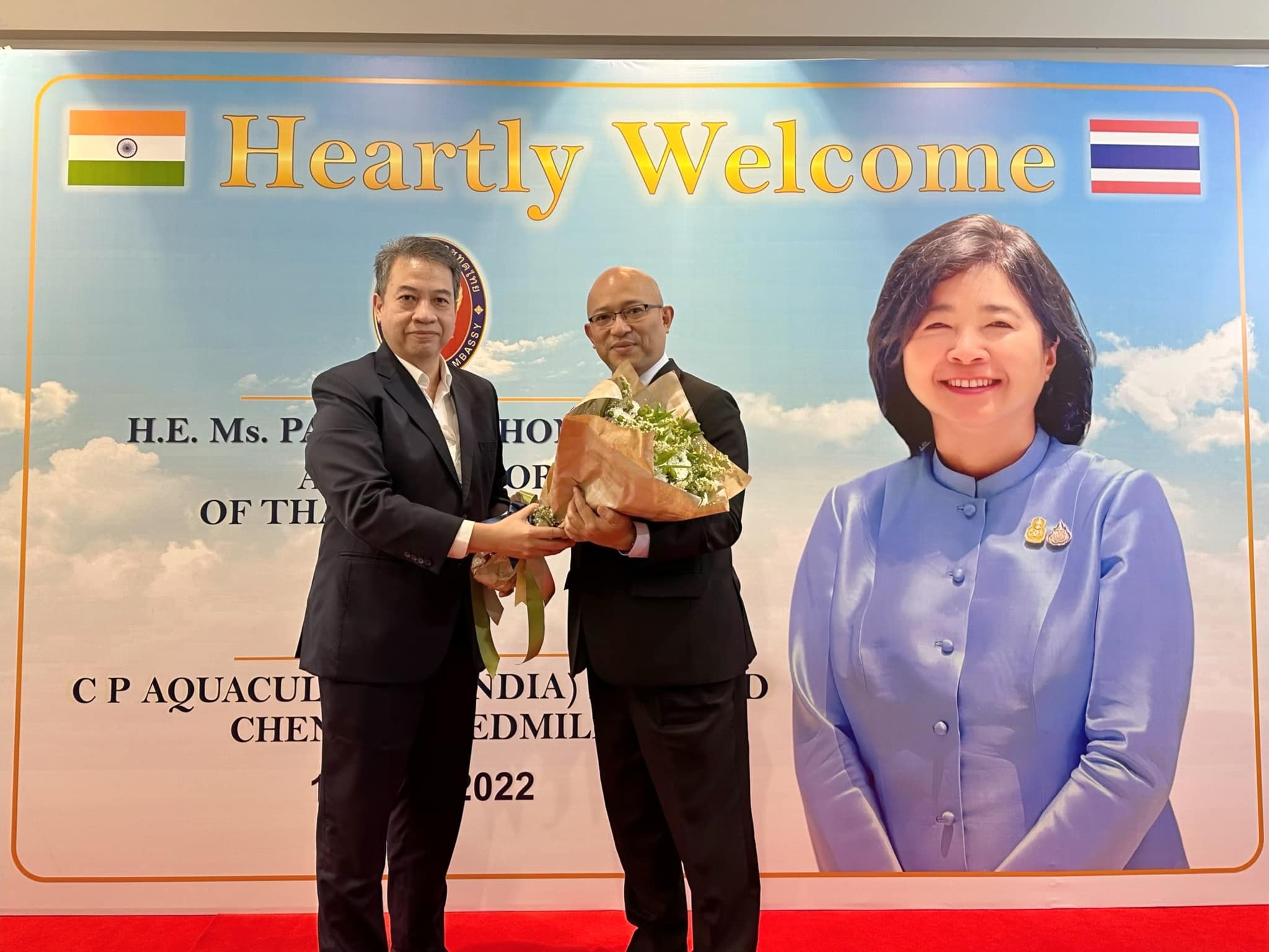 คุณภัทรัตน์ หงส์ทอง เอกอัครราชทูต ณ กรุงนิวเดลี สาธารณรัฐอินเดีย นำคณะข้าราชการสถานกงสุลใหญ่ ณ เมืองเจนไน เมืองมุมไบ และเมืองกัลกัตตา เยี่ยมชมกิจการ CPF อินเดีย เพื่อรับฟังสถานการณ์ปัจจุบันของธุรกิจสัตว์น้ำ รวมถึงโอกาสในการลงทุนของภาคเอกชนไทยในอินเดีย โดยมี คุณวิชิต ธเนศานุรักษ์ กรรมการผู้จัดการ ธุรกิจสัตว์น้ำ CPF อินเดีย ให้การต้อนรับ ณ โรงงานสัตว์น้ำ CPF อินเดีย เมืองเจนไน รัฐทมิฬนาฑู ประเทศอินเดีย