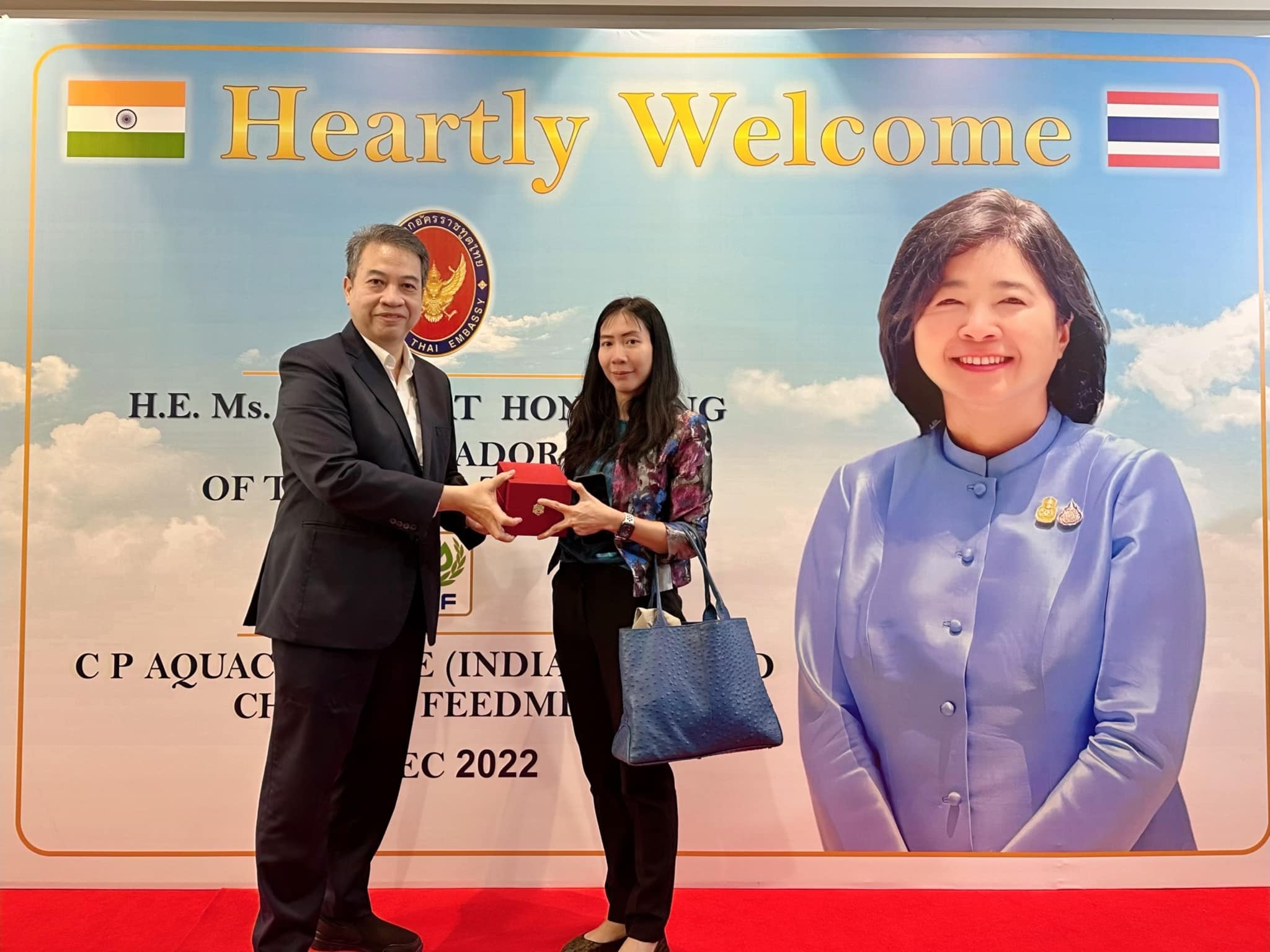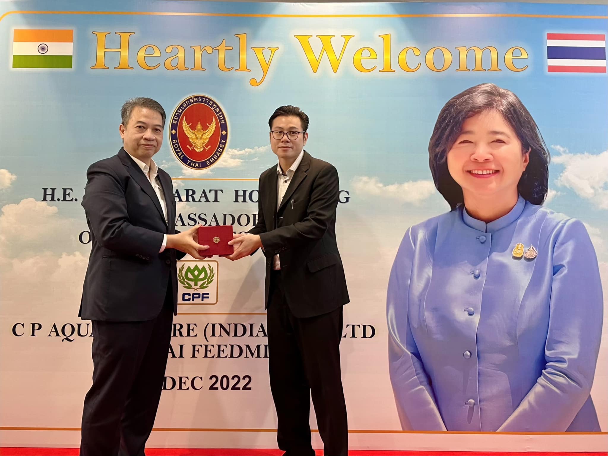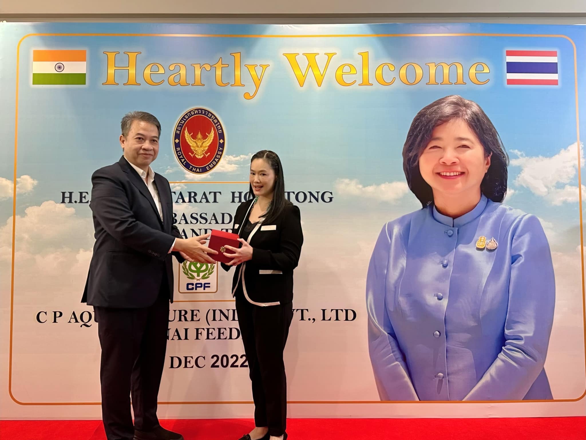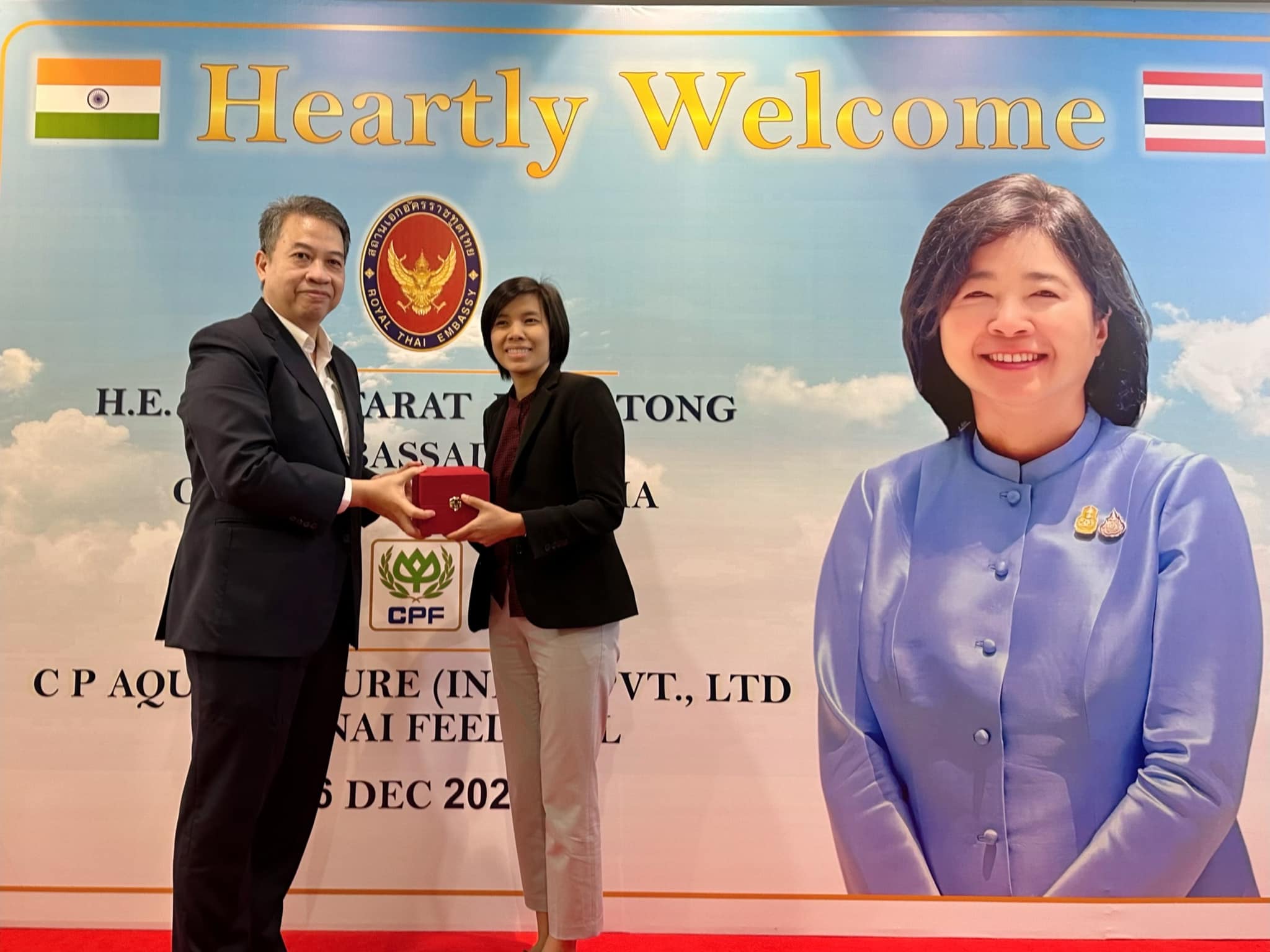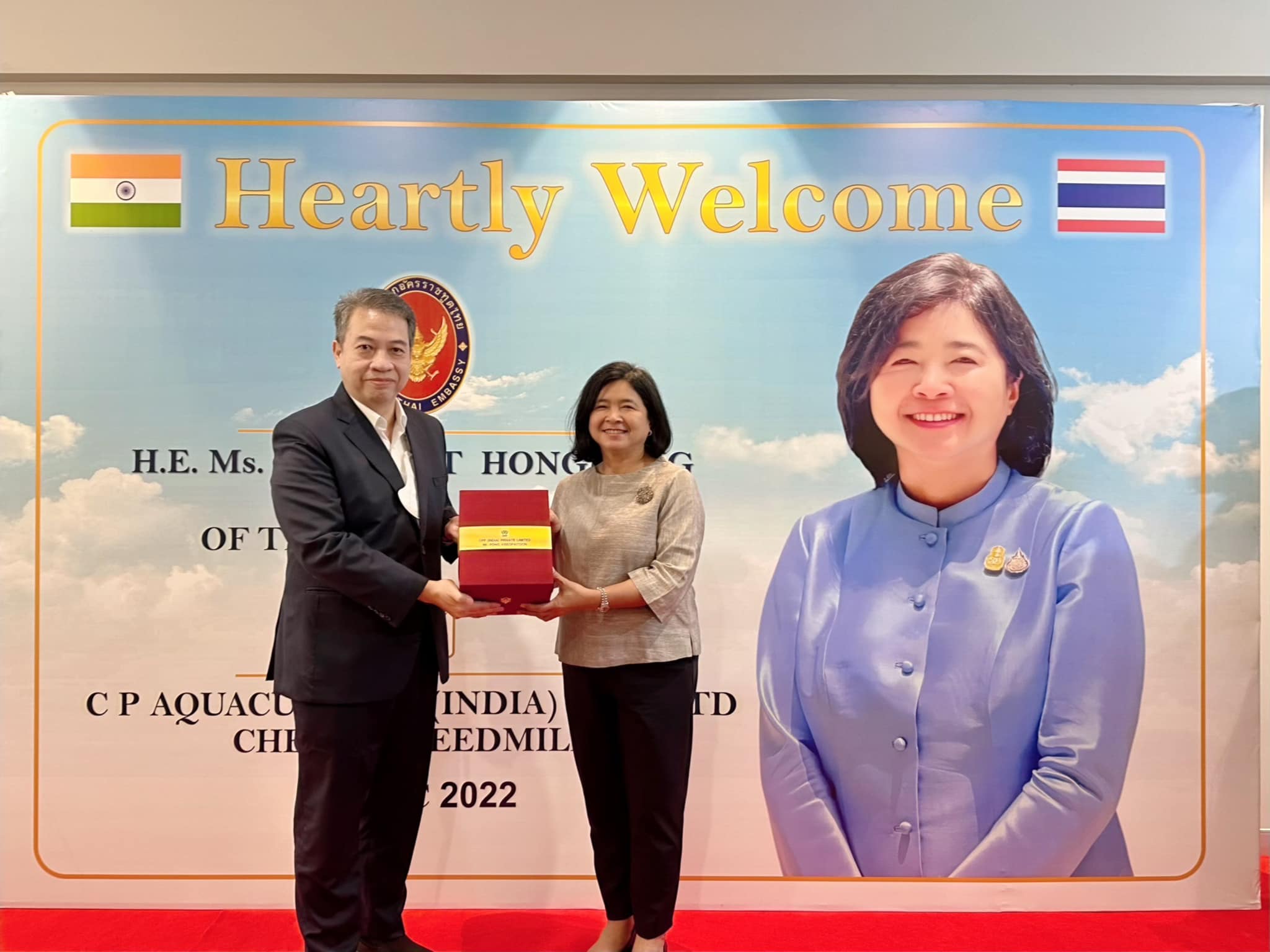 คุณภัทรัตน์ หงส์ทอง เอกอัครราชทูต ณ กรุงนิวเดลี สาธารณรัฐอินเดีย นำคณะข้าราชการสถานกงสุลใหญ่ ณ เมืองเจนไน เมืองมุมไบ และเมืองกัลกัตตา เยี่ยมชมกิจการ CPF อินเดีย เพื่อรับฟังสถานการณ์ปัจจุบันของธุรกิจสัตว์น้ำ รวมถึงโอกาสในการลงทุนของภาคเอกชนไทยในอินเดีย โดยมี คุณวิชิต ธเนศานุรักษ์ กรรมการผู้จัดการ ธุรกิจสัตว์น้ำ CPF อินเดีย ให้การต้อนรับ ณ โรงงานสัตว์น้ำ CPF อินเดีย เมืองเจนไน รัฐทมิฬนาฑู ประเทศอินเดีย