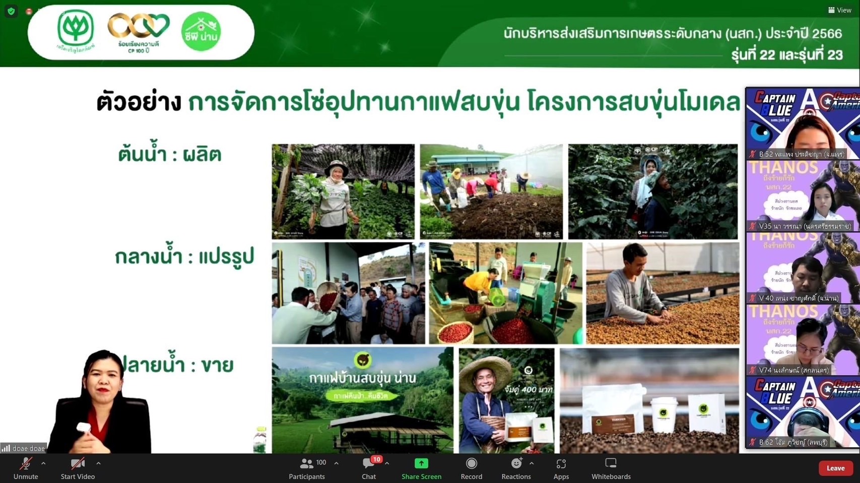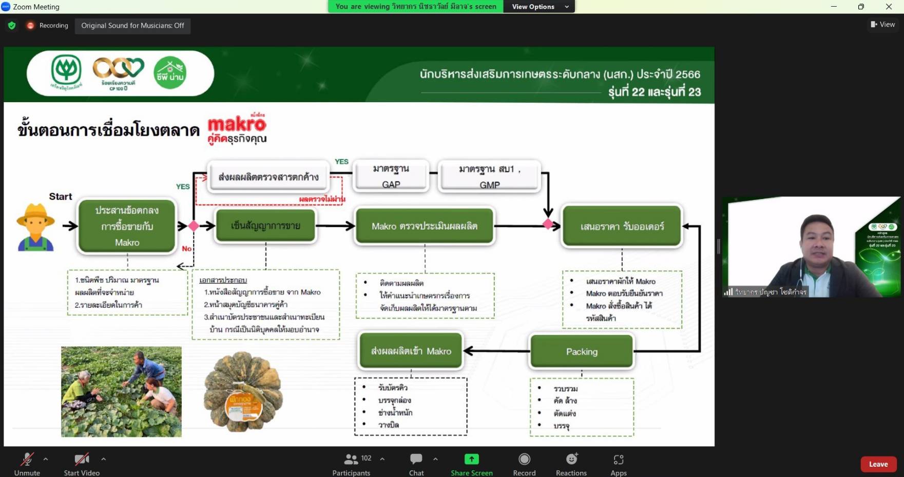การบรรยายในรูปแบบออนไลน์ จัดขึ้นเมื่อวันที่ 30 พ.ค. 2566 ในหัวข้อการจัดการระบบห่วงโซ่อุปทานสินค้าเกษตรและการวางแผนโมเดลธุรกิจเกษตร แนวทางการสร้างตลาด Online และ Offline ด้วยการใช้นวัตกรรม เครื่องมือ และเทคโนโลยี และกรอบแนวคิดการออกแบบและพัฒนาบรรจุภัณฑ์เพื่อส่งมอบให้กับลูกค้า โดยมุ่งหวังให้ผู้นำที่จะก้าวเข้าสู่การเป็นนักบริหารส่งเสริมการเกษตร นำความรู้ไปถ่ายทอดและต่อยอดในการปฏิบัติงานด้านการเกษตรได้อย่างเป็นรูปธรรม