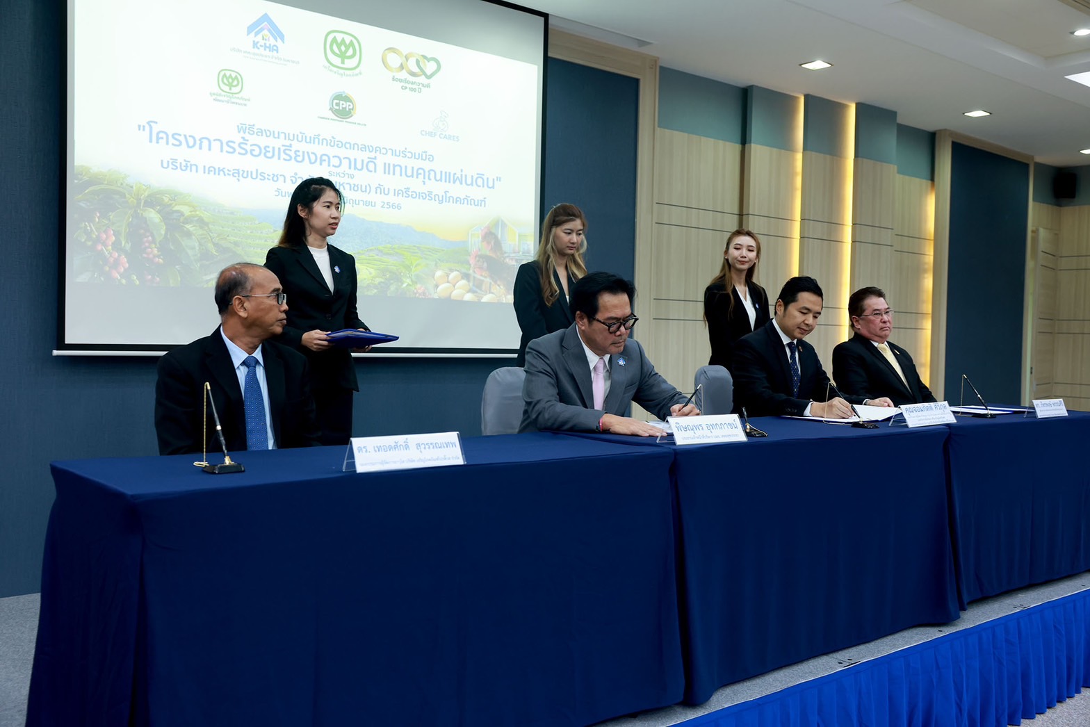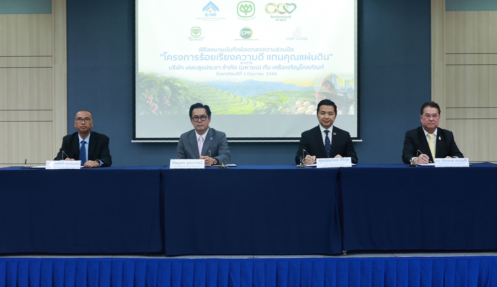 ด้าน คุณจอมกิตติ ศิริกุล รองกรรมการผู้จัดการใหญ่อาวุโส ด้านพัฒนาความยั่งยืนภาครัฐเเละกิจการสัมพันธ์ เครือเจริญโภคภัณฑ์ และกรรมการและเลขาธิการ มูลนิธิเจริญโภคภัณฑ์พัฒนาชีวิตชนบท กล่าวว่า เครือเจริญโภคภัณฑ์ยึดมั่นในปรัชญา 3 ประโยชน์ ที่ดำเนินธุรกิจโดยคำนึงถึงประโยชน์ของประเทศชาติ ประชาชนเป็นสำคัญ และมุ่งมั่นในการตอบแทนคุณแผ่นดินเสมอมา โดยการร่วมลงนามบันทึกข้อตกลง “โครงการร้อยเรียงความดี แทนคุณแผ่นดิน” ในครั้งนี้ ถือเป็นอีกหนึ่งภารกิจหลักที่เครือเจริญโภคภัณฑ์ตั้งใจร่วมพัฒนาคุณภาพชีวิตของผู้เช่าบ้าน “เคหะสุขประชา” ให้มีโอกาสทางอาชีพที่หลากหลาย ซึ่งนำไปสู่ความเป็นอยู่ที่ดีทั้งทางกายและใจ โดยมีบริษัทในเครือเจริญโภคภัณฑ์ ร่วมภารกิจ นำโดย เครือเจริญโภคภัณฑ์ บริษัท เจริญโภคภัณฑ์โปรดิ๊วส จำกัด และ บริษัท เชฟแคร์ส โปรเจกต์ จำกัด