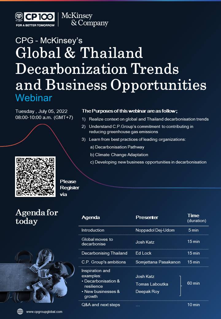 สำนักบริหารความยั่งยืน ธรรมาภิบาล และสื่อสารองค์กร เครือเจริญโภคภัณฑ์ ร่วมกับ McKinsey & Company จัดการสัมมนาในรูปแบบออนไลน์ ในหัวข้อ “Global & Thailand Decarbonization Trends and Business Opportunities” ในวันอังคารที่ 5 กรกฎาคม พ.ศ. 2565 เวลา 8:00 น. – 10:00 น. (เวลาประเทศไทย) สำหรับผู้บริหาร คณะทำงานด้านความยั่งยืน และพนักงานที่สนใจ