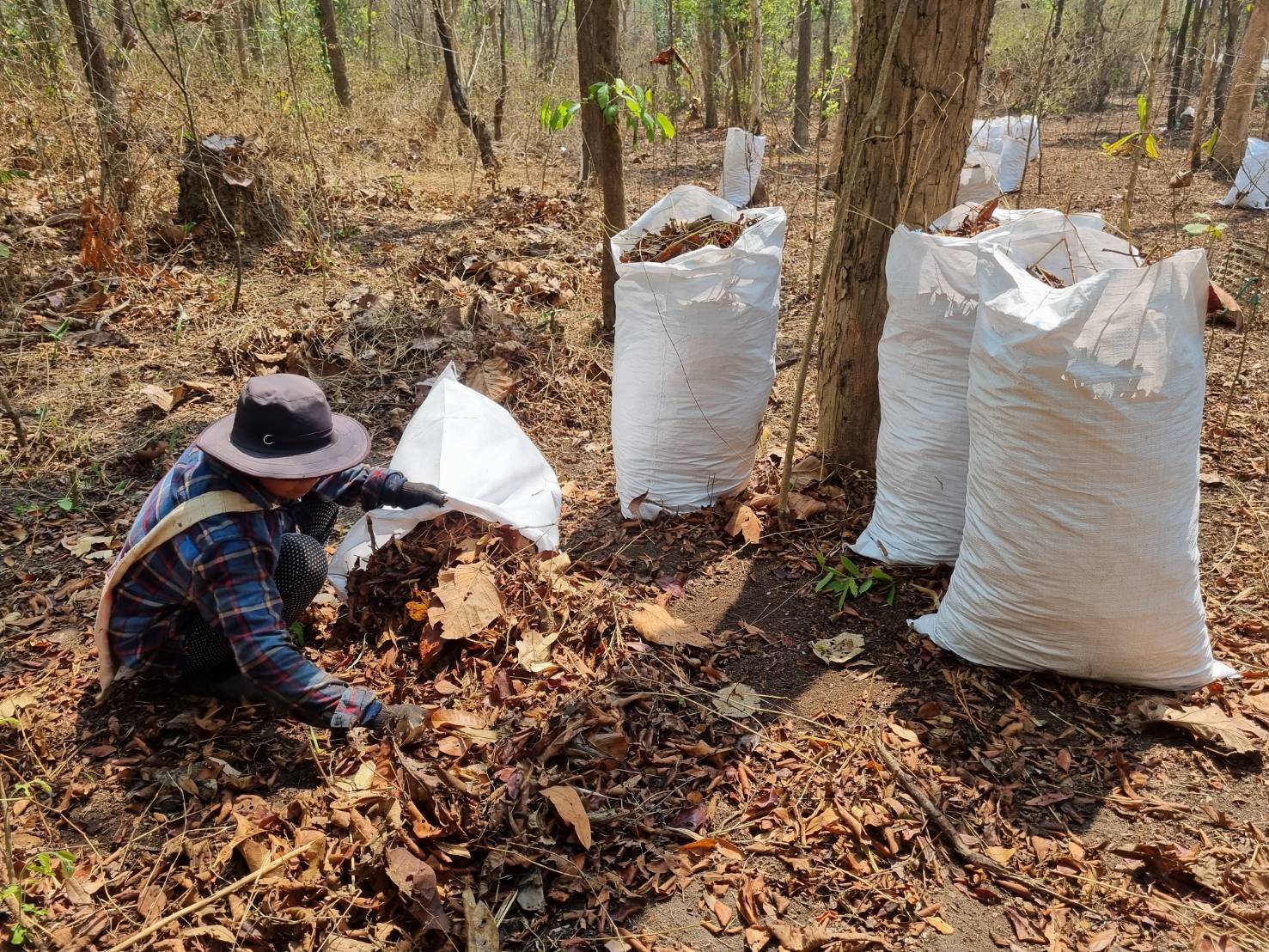 นายฐิติกร ใจดี ผู้ช่วยผู้ใหญ่บ้าน บ้านมหาธาตุ หมู่ 4 เล่าว่า ชุมชนเราพยายามผลักดันที่จะปลูกฝังให้ชาวบ้านเห็นคุณค่าของทรัพยากร ไม่เผาป่า โดยที่ผ่านมาชาวบ้านจึงช่วยกันลาดตระเวนเฝ้าระวังไฟป่า ทำแนวกันไฟ ทำฝายชะลอน้ำตามลำห้วย เรานำใบตองมาทำเป็นจานข้าว และใบไม้อีกส่วนหนึ่งนำมาทำหลังคาบ้าน แต่ก็ยังไม่ได้ช่วยสร้างรายได้ให้ชุมชน การทำโครงการ “ป่าปลอดเผา” โดยให้คนในชุมชนร่วมเก็บใบไม้แห้งในป่าชุมชน โดยเฉพาะผู้สูงอายุและผู้ที่ไม่มีสัญชาติ ที่ไม่มีงาน ไม่มีรายได้ ได้เข้ามามีส่วนร่วมในโครงการฯ เมื่อนำใบไม้ไปทำปุ๋ย ก็ยังเพิ่มรายได้ ช่วยลดต้นทุนทางการเกษตร โดยจะนำไปขายในสวนสมุนไพร ชาวบ้านก็จะได้ลดการใช้สารเคมีในพื้นที่ด้วย