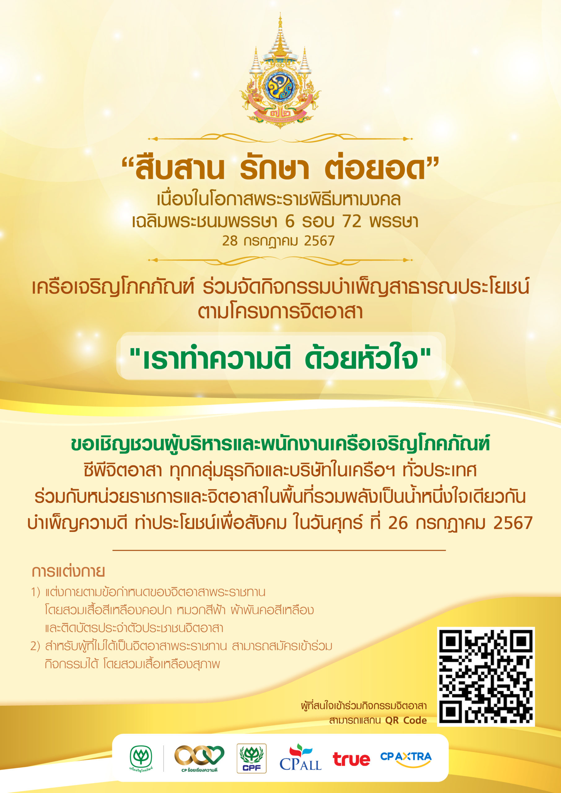 เครือเจริญโภคภัณฑ์ จึงขอเชิญชวนคนซีพีจิตอาสาทุกกลุ่มธุรกิจและบริษัทในเครือฯทั่วประเทศ ร่วมกับหน่วยราชการและจิตอาสาในแต่ละพื้นที่ รวมพลังเป็นน้ำหนึ่งใจเดียวกัน บำเพ็ญความดี ทำประโยชน์เพื่อสังคม ตามพระราโชบายของพระบาทสมเด็จพระเจ้าอยู่หัวในการบำเพ็ญสาธารณประโยชน์ ตามโครงการจิตอาสาพระราชทาน โครงการจิตอาสา “เราทำความดี ด้วยหัวใจ” ในวันศุกร์ที่ 26 กรกฎาคม 2567 เวลา 9.00-17.00 น. ในพื้นที่ตามแต่ละกลุ่มธุรกิจพิจารณาตามความเหมาะสม