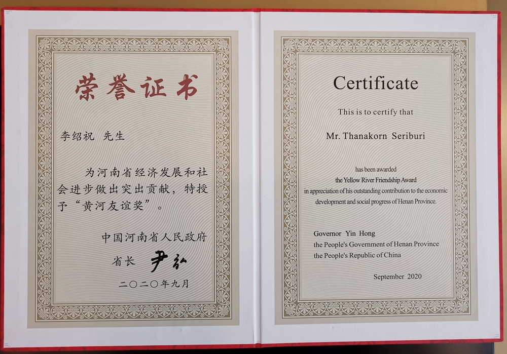 เครือเจริญโภคภัณฑ์ ขอแสดงความยินดีกับ คุณธนากร เสรีบุรี รองประธานกรรมการอาวุโส เครือเจริญโภคภัณฑ์ นายกสมาคมส่งเสริมการลงทุนและการค้าไทยจีน เป็น 1 ใน 10 ชาวต่างชาติที่ได้รับรางวัล ‘มิตรภาพแม่น้ำหวง’(黄河友谊奖)ซึ่งเป็นรางวัลเกียรติยศสูงสุดที่มอบให้แก่ชาวต่างประเทศที่มีอุปการคุณกับมณฑลเหอหนาน โดยได้รับเกียรติจากนายหยิ่นหง ผู้ว่ามณฑลเหอหนาน เป็นผู้มอบรางวัลอันทรงเกียรติดังกล่าว เมื่อวันที่ 30 กันยายน 2563 ในวารดิถีก่อนวันชาติจีน
