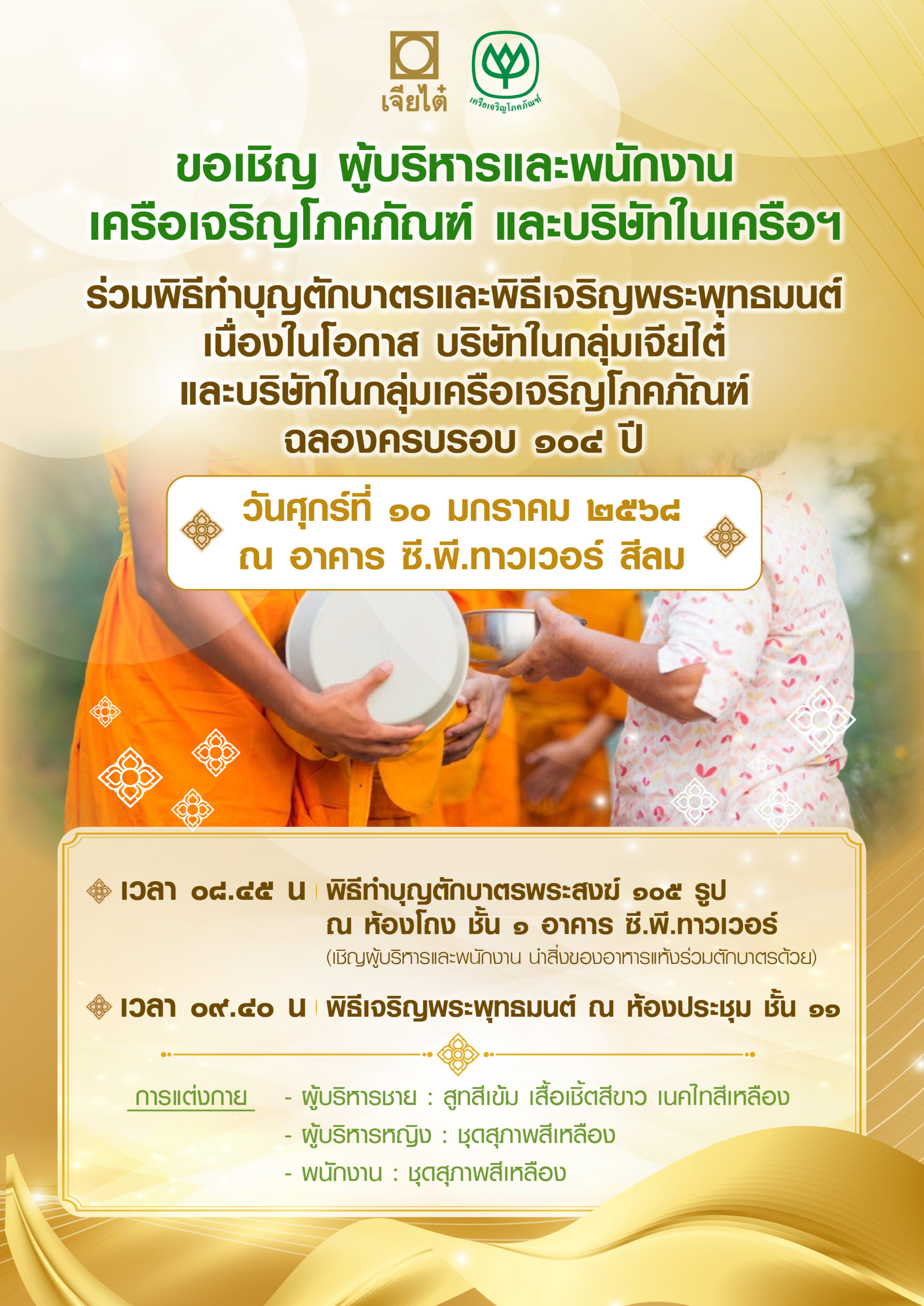 ขอเชิญผู้บริหาร และพนักงาน เครือเจริญโภคภัณฑ์ และบริษัทในเครือฯ ร่วมทำบุญพิธีเจริญพระพุทธมนต์ฉลอง ๑๐๔ ปี เจียไต๋ – เครือเจริญโภคภัณฑ์ ในวันศุกร์ที่ ๑๐ มกราคม ๒๕๖๘ ณ อาคารซี.พี.ทาวเวอร์ สีลม 3 มกราคม 25683 มกราคม 2025SystemNews, กิจกรรมและสิทธิประโยชน์ Post Views: 721