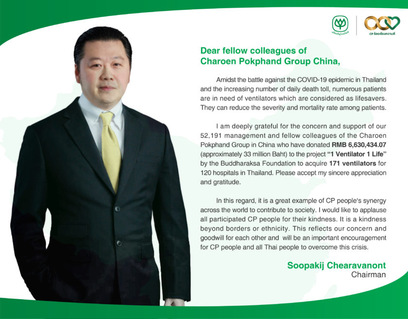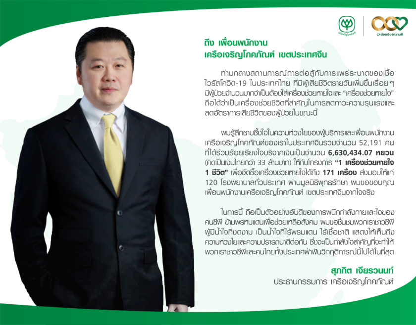 ในการนี้ คุณสุภกิต เจียรวนนท์ ประธานกรรมการ เครือเจริญโภคภัณฑ์ ได้ส่งสารแสดงความขอบคุณไปยังผู้บริหารและพนักงานซีพีจำนวนกว่า 5.2 หมื่นคน ในประเทศจีนผ่านสื่ออิเล็กทรอนิกส์ออนไลน์ ความว่า ท่ามกลางสถานการณ์การต่อสู้กับการแพร่ระบาดของเชื้อไวรัสโควิด-19 ในประเทศไทย ที่มีผู้เสียชีวิตรายวันเพิ่มขึ้นเรื่อย ๆ มีผู้ป่วยจำนวนมากจำเป็นต้องใส่เครื่องช่วยหายใจและ “เครื่องช่วยหายใจ” ถือได้ว่าเป็นเครื่องช่วยชีวิตที่สำคัญในการลดภาวะความรุนแรงและลดอัตราการเสียชีวิตของผู้ป่วยในขณะนี้