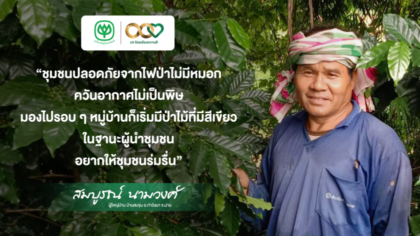 นอกจากผู้นำภายในเครือซีพีแล้ว ผู้นำชุมชนอย่าง คุณสมบูรณ์ นามวงค์ ผู้ใหญ่บ้าน บ้านสบขุ่น อ.ท่าวังผา จ.น่าน ก็มีส่วนสำคัญในการผลักดันการทำงานภายในชุมชน เผยว่า การร่วมงานกับซีพีสามารถช่วยชุมชนได้มีพืชทางเลือก มีรายได้ในครัวเรือน คนในชุมชนมีความหวังเพิ่มขึ้น “ชุมชนปลอดภัยจากไฟป่าไม่มีหมอก ควันอากาศไม่เป็นพิษมองไปรอบ ๆ หมู่บ้านก็เริ่มมีป่าไม้ที่มีสีเขียว ในฐานะผู้นำชุมชนอยากให้ชุมชนร่มรื่น”