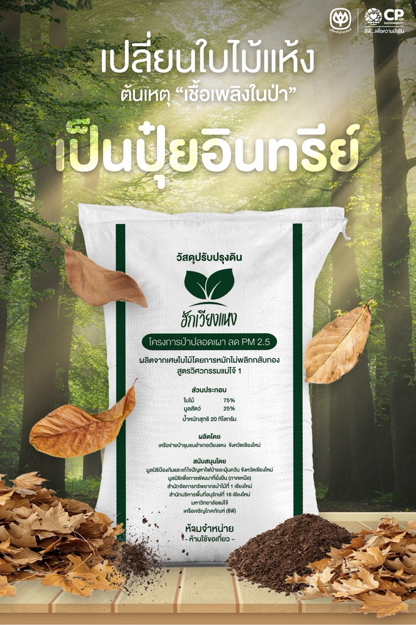 ส่วนด้านภาคการศึกษา ก็เข้ามามีบทบาทสำคัญ โดย ดร.แสนวสันต์ ยอดคำ อาจารย์ประจำสาขาวิชาวิศวกรรมเกษตร คณะวิศวกรรมและอุตสาหกรรมเกษตร มหาวิทยาลัยแม่โจ้ เล่าว่า แหล่งที่มาขอหมอกควันไฟป่าและฝุ่นควัน แบ่งออกเป็นหลักๆ 3 ส่วน คือ 1. ภาคการเผาป่าชุมชนบ้านเรือน 2.ภาคเกษตรกรรม และ 3.ไฟที่เผาไหม้เชื้อเพลิงตามธรรมชาติในป่า มหาวิทยาลัยแม่โจ้ จึงได้ทำการศึกษาวิธีกระบวนการทำปุ๋ยโดยไม่ต้องพลิกกลับกอง โดยใช้เศษวัสดุเหลือทิ้งจากภาคการเกษตร หรือใบไม้แห้งที่เป็นเชื้อเพลิงในป่า มาผสมกับมูลสัตว์ เพื่อหาแนวทางในการจัดการโดยไม้ต้องเผามาเป็นทางเลือกให้แก่ชุมชนและเกษตรกร สำหรับโครงการ “ป่าปลอดเผา” สนับสนุนโดยเครือซีพี ในช่วงที่ผ่านมา มีการรับซื้อใบไม้แห้งจากชุมชนที่เก็บมาจากป่าชุมชนใน อ.เวียงแหง จำนวน 74,925 กิโลกรัม ก็นำมาแปรรูปเป็นวัสดุปรับปรุงดินที่มีคุณภาพ โดยใช้องค์ความรู้ดังกล่าวฯ จนสามารถลดเชื้อเพลิงในป่าได้