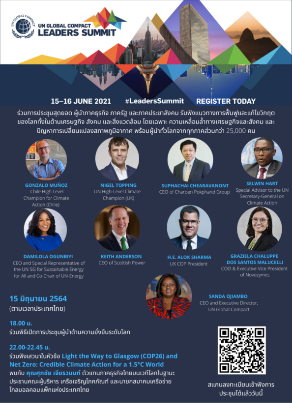 เชิญชวนผู้บริหารและพนักงานในเครือฯ ร่วมลงทะเบียนสัมมนาออนไลน์โดยไม่มีค่าใช้จ่าย ได้ตั้งแต่วันนี้ที่ https://globalcompact-th.com/UNGCLeadersSummit2021
