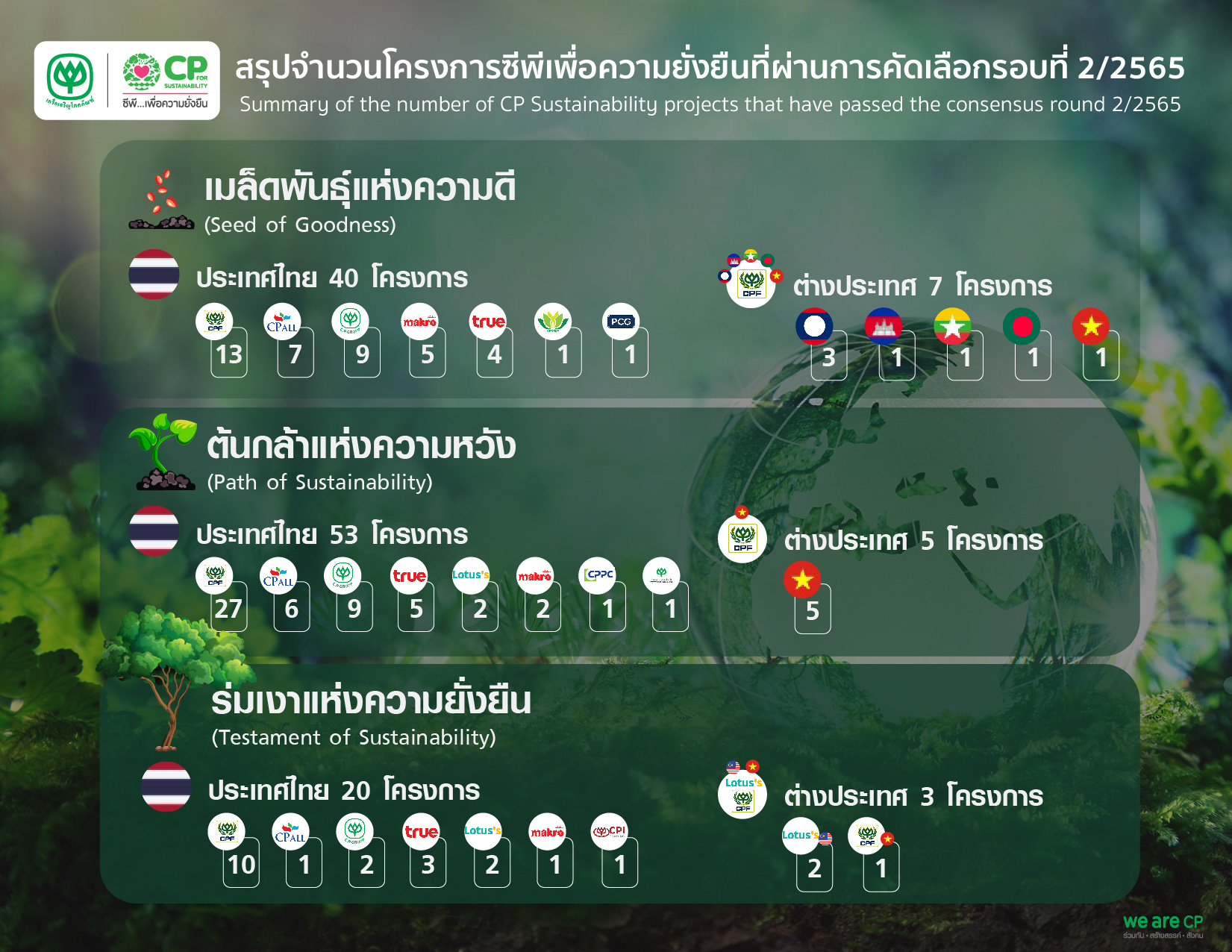 ทั้งนี้ จากข้อมูลรายงานความคืบหน้า โครงการซีพีเพื่อความยั่งยืนประเภท เมล็ดพันธุ์แห่งความดี (Seed of Goodness) ที่ผ่านเข้ารอบสองจากประเทศไทย มีจำนวน 40 โครงการ และต่างประเทศ 7 โครงการ ประเภท ต้นกล้าแห่งความหวัง (Path of Sustainability) จากประเทศไทย จำนวน 53 โครงการ และต่างประเทศ 5 โครงการ และประเภท ร่มเงาแห่งความยั่งยืน (Testament of Sustainability) จากประเทศไทย จำนวน 20 โครงการ และต่างประเทศ 3 โครงการ